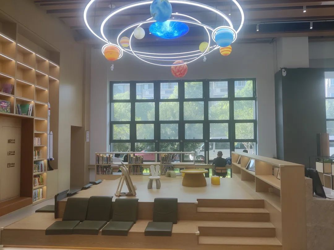 阅读空间的设计以航天为主题,以蓝色吊顶和太阳系吊灯为特色,搭配飞船、火箭和宇航员模型,营造浓厚的航天氛围。阅读区含绘本与电子资源,满足不同年龄需求。互动体验区让访客亲手制作模型或绘画太空。休息交流区设舒适沙发,适合家长与孩子交流,也是举办科普讲座和活动的理想场所。