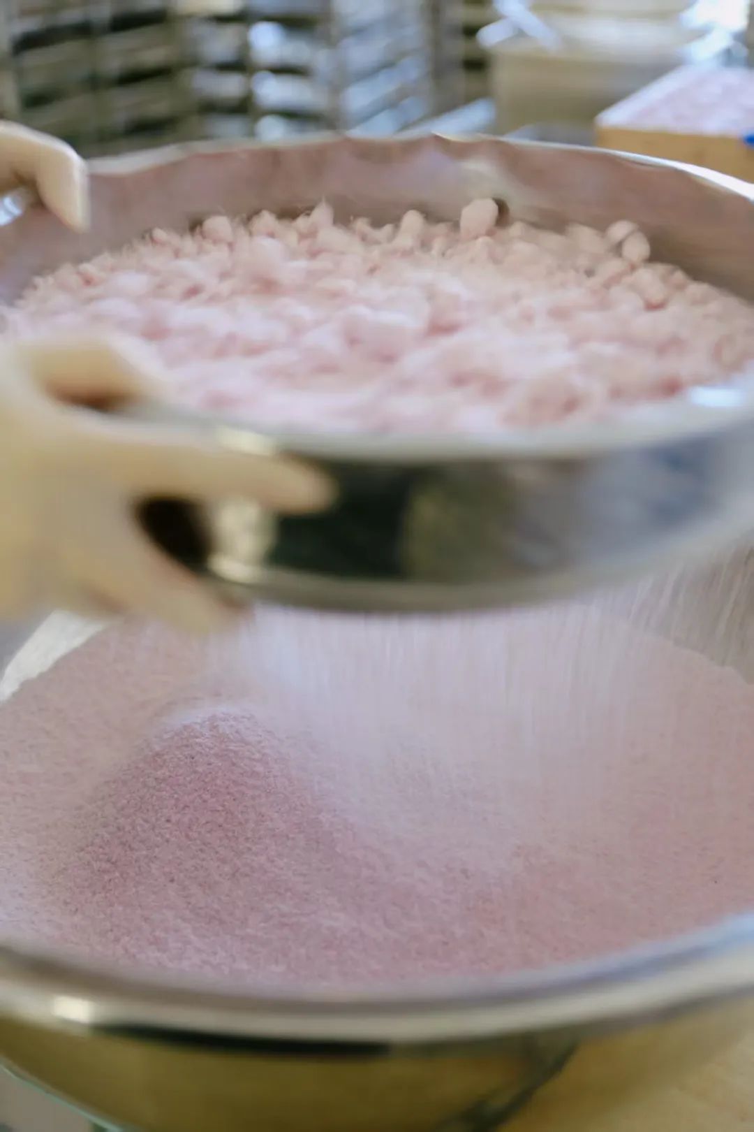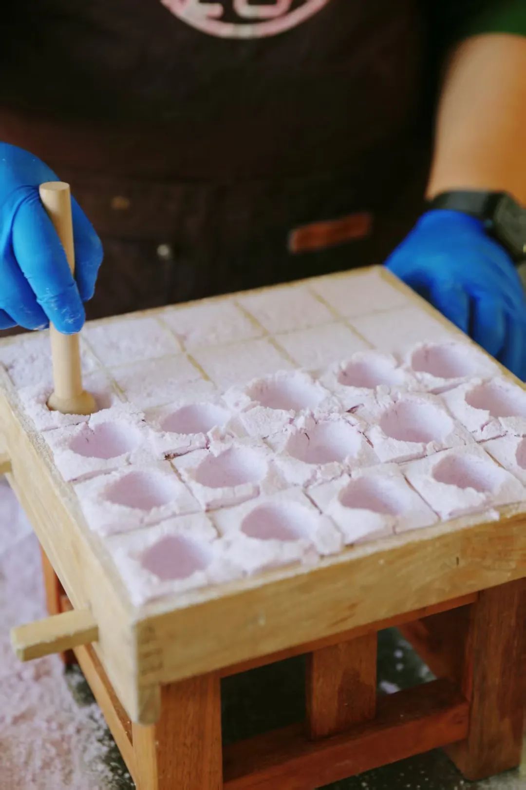 每天,工作人员会提前将大米、糯米浸泡8小时,沥干水后打磨成粉,再拌上绵白糖,充分搅拌后开始筛粉。随后,将筛好的粉倒入模具中,再将馅料放入,最后用糯米粉填平模具,放进蒸箱。大约30分钟后,热气腾腾、软糯香甜的方糕就出炉了。