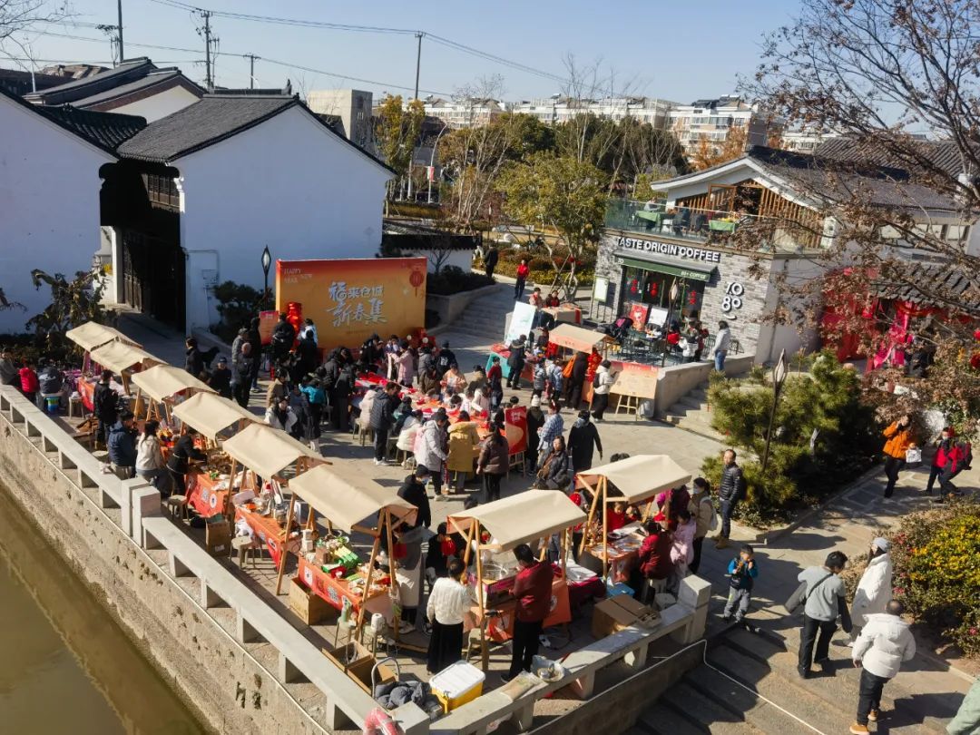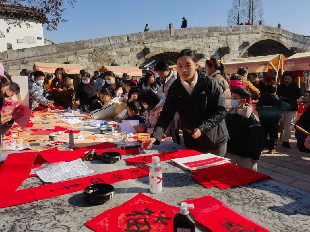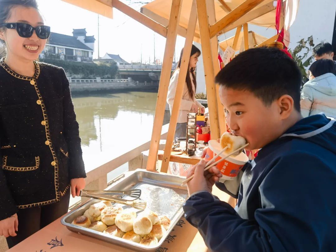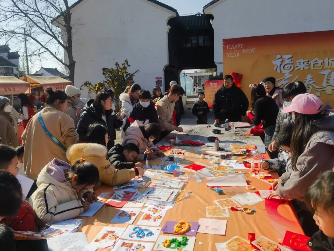 近日,“福来仓城新春集”在大仓桥畔举办。煎得金黄的水煎包滋滋作响,煮开的豆奶翻滚着,就连冬日暖阳下金灿灿的糖画都看起来格外甜。人们热热闹闹地围在长桌四周,写春联、剪窗花,提前感受过年的氛围。