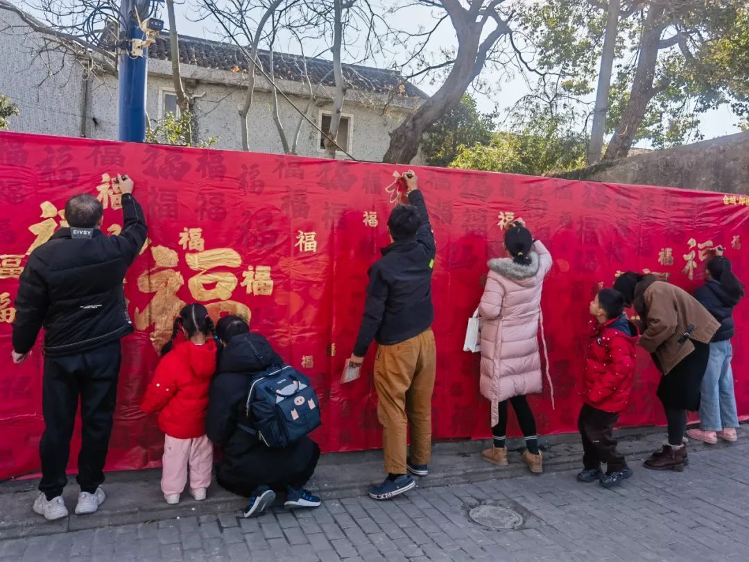 大仓桥北面的陆氏宅里,“人生答案”互动展区吸引了不少游客来参观打卡,尤其是小朋友们,在家长的引导下认认真真做起了手工。大仓桥南面的墙上,“百福墙”也吸引了很多游客驻足描金“福”、集福卡,许下新年心愿。