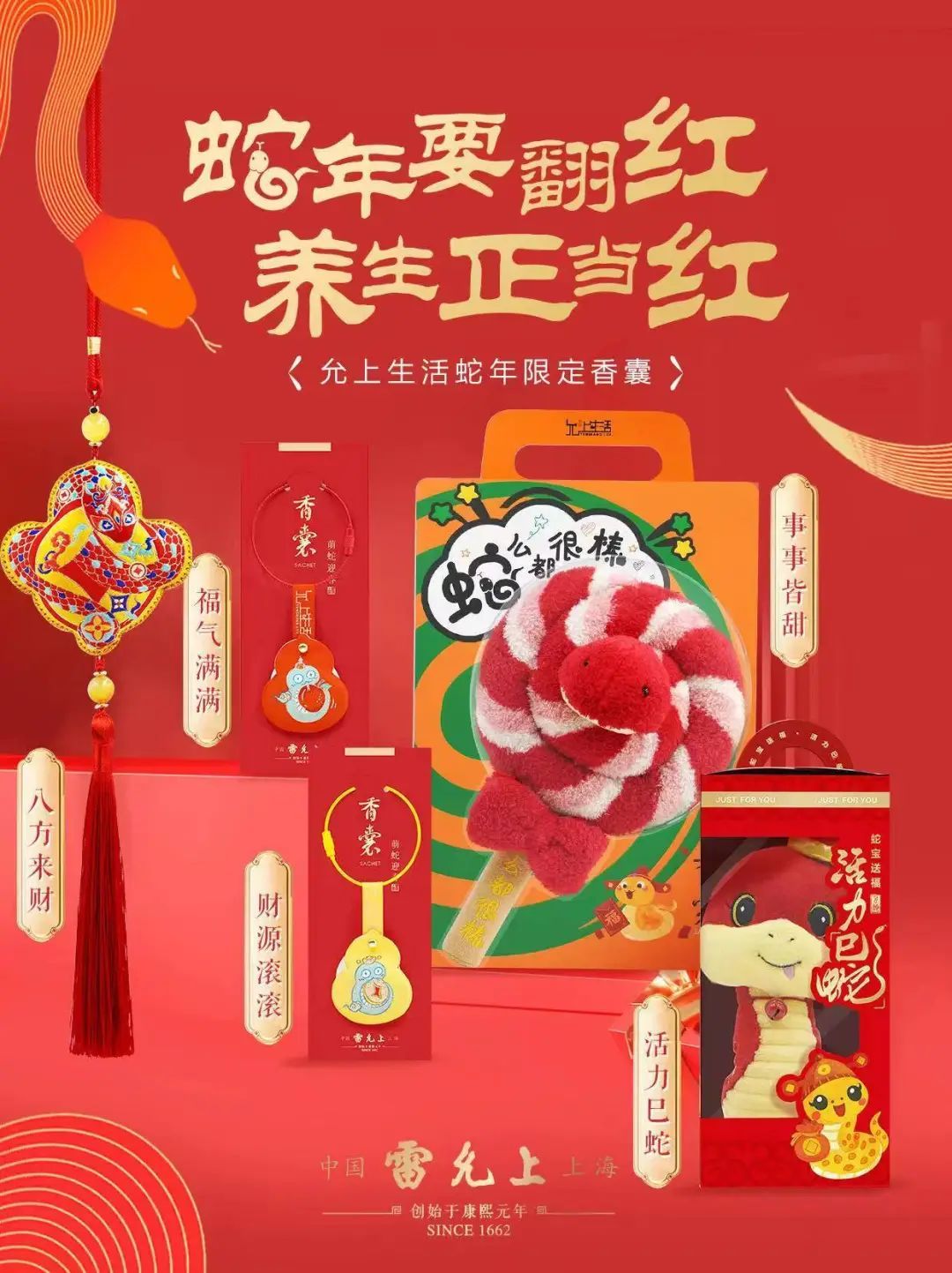 作为首个“非遗春节”的贺岁献礼,雷允上西区充分结合中国传统文化,带来首发4款蛇年创意香囊,庆贺新春。