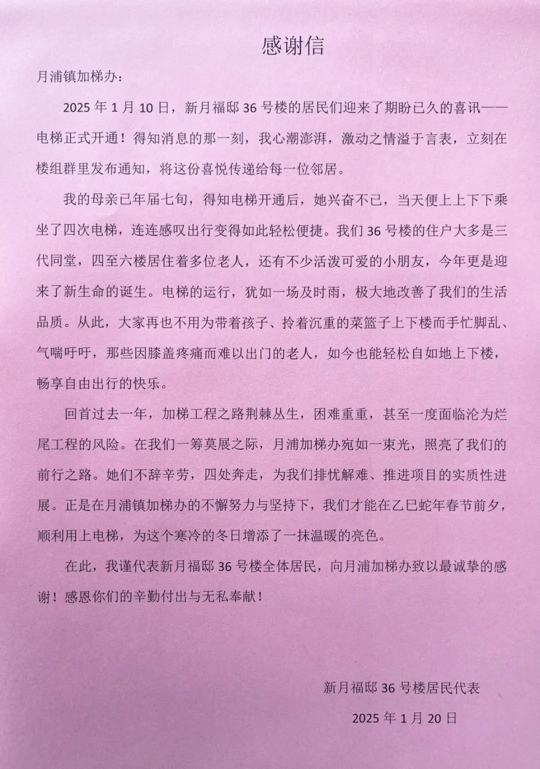 新月福邸36号楼的居民代表心怀感激,将一封饱含真挚情感的感谢信送到了加梯办工作人员手中,字里行间都表达了对加梯这一民心工程的认可与赞誉。这幢楼内的居民多数为高龄老人,新电梯的顺利启用,不仅改善了他们的居住环境,更为他们的日常生活带来了实实在在的便利。