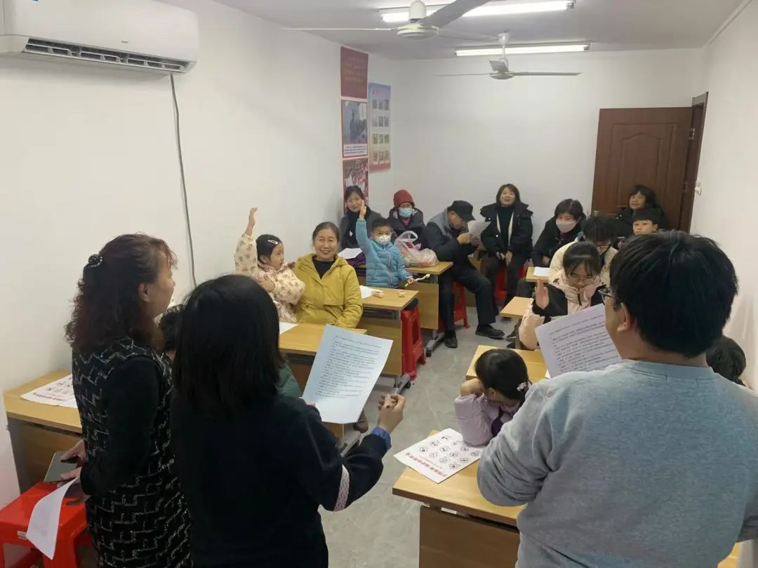 楼内的“社区小先生”们集聚一堂,共同书写福字、制作福桶,现场气氛欢快而热烈。