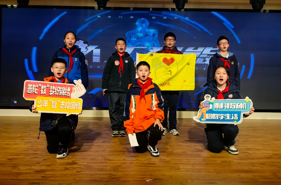 在“数字寻踪·普陀印象”成果汇报展示中,九支小队以团队展示的形式分享活动中的所思所获,并围绕人工智能、AI科技、数字化转型等内容,策划主题中队会,阐释活动设计思路和意图。活动评选出最佳“小小讲解员”、最佳团队、优秀学员。
