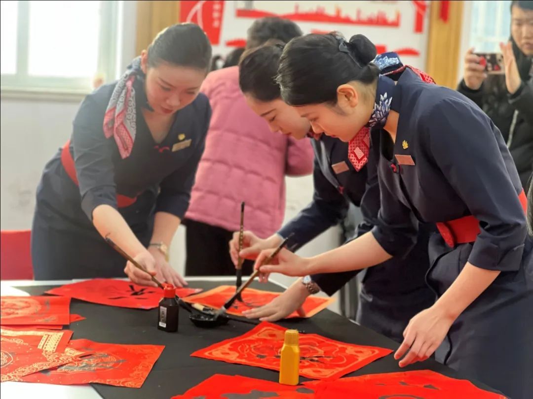 在老师的指导下,乘务员们也拿起笔墨,学习书写“福”字。楷书、草书、隶书……不同字体的“福”字让这个新年更有年味儿。“我还是第一次学习书法,今天第一次有了自己的‘福’字。”一位乘务员开心地说。