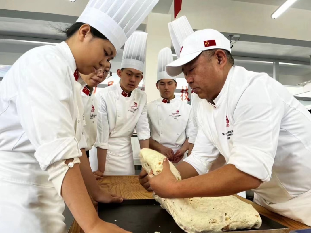 △于师傅(最右)指导第47届世界技能大赛烘焙项目参赛者