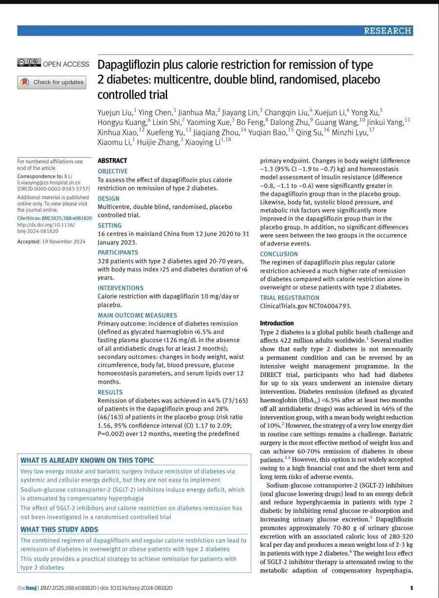 1月23日,复旦大学附属中山医院发布内分泌领域重大临床研究成果,由中山医院内分泌科李小英、李晓牧教授团队联合南方医科大学南方医院张惠杰教授团队在国际顶级学术期刊《英国医学杂志》(BMJ)发表重要研究成果显示:达格列净联合生活方式干预在超重或肥胖2型糖尿病患者中可达到糖尿病缓解。达格列净是一种口服降糖药。