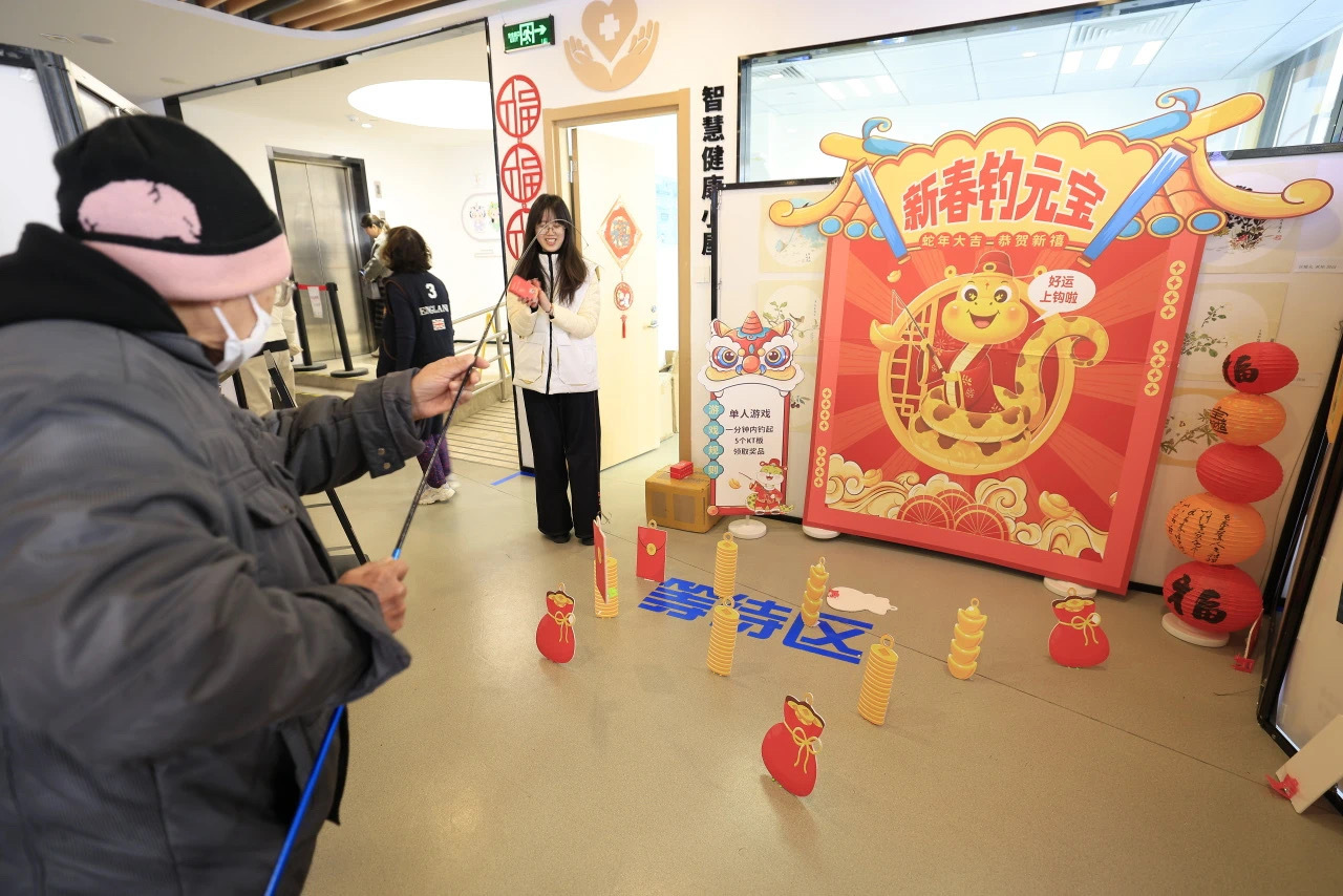在胶州片区,长寿社区文化活动中心、长寿路街道社区学校联合玉佛禅寺,开展了“大爱长寿”,迎新祈“福”——“蛇”尖上的非遗主题活动。写福字、写春联、钓“福袋”……丰富多彩的活动吸引了众多居民排队参与,现场人头攒动、热闹非凡。
