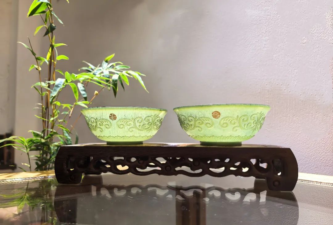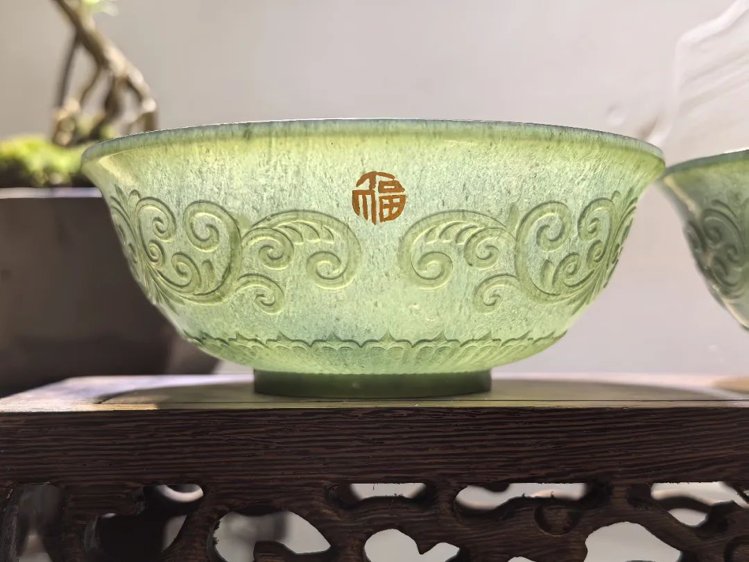 《福禄寿迎春碗》由张超和邵冰联袂打造,碗体材质采用和田玉青玉,制作方法运用了玉雕中的薄胎工艺,做工精细,令人赞叹。