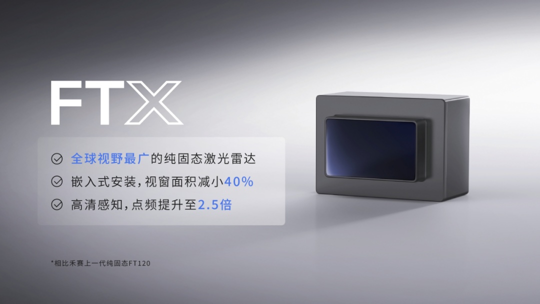 禾赛FTX作为禾赛第二代纯固态超广角激光雷达,采用纯固态电子扫描技术实现了最大视场角180°x140°,是全球视野最广的纯固态车规级激光雷达。FTX测距能力在10%反射率下可达到30米,分辨率点频是上一代的2.5倍,达到49.2万点每秒,能实现对盲区的高清扫描。相比上一代产品,它的重量减少了66%,嵌入安装时外露视窗面积仅为50x30毫米,造型更为小巧美观。