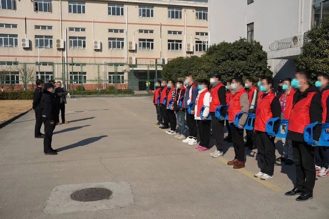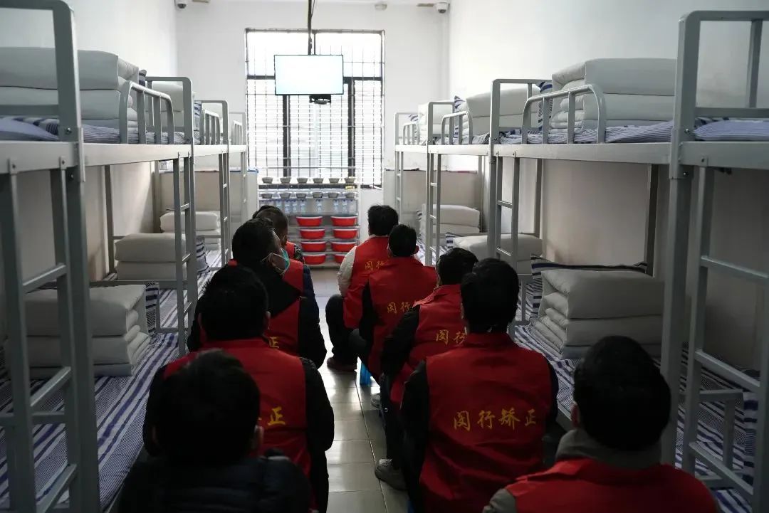在民警带领下,社区矫正对象统一身着标识性马甲,整齐有序走进监狱大门,零距离了解狱内改造环境,并观看《罪犯行为规范教育片》。为进一步加深狱内行为规范印象,监狱民警着重讲解并示范了“板凳操、队列操、内务操”,并组织矫正对象进行简单动作要领、行为规范训练。