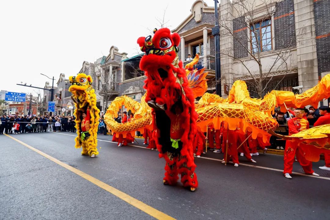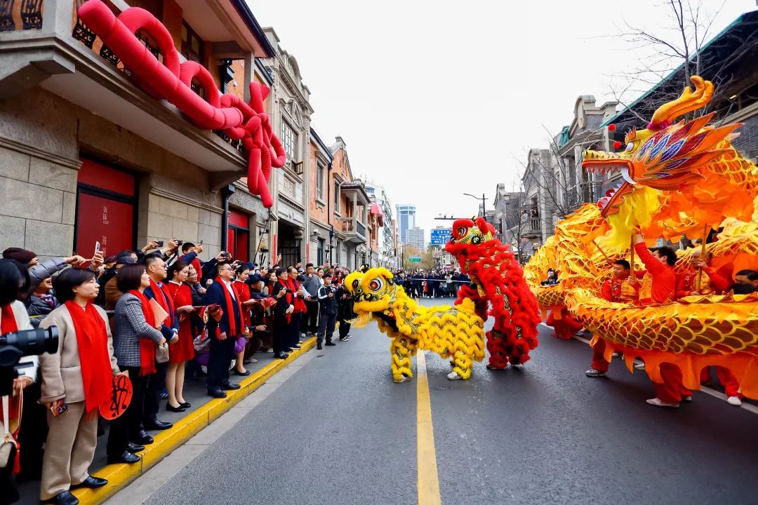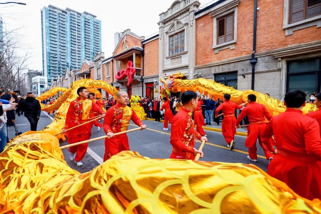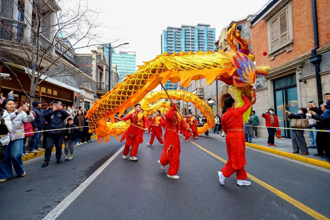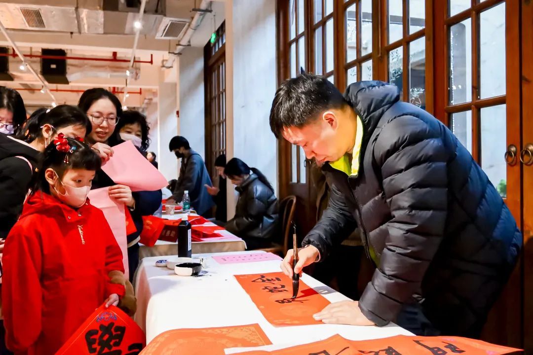 在张园和茂名北路限时步行街上,来自三林舞龙队的金色祥龙灵动穿梭,时而翻腾跳跃、时而盘旋游走。金龙舞动,舞出新春的祝福,舞出满满的年味。来自上海市书法家协会的10位艺术名家同样笔走龙蛇,为市民们送上一幅幅翰墨飘香的“福”字、春联。