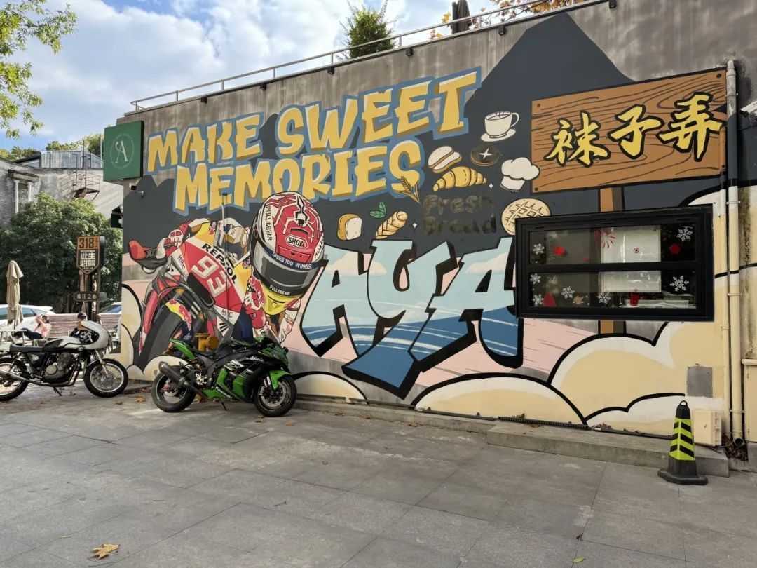 随着公众号“落叶不扫”的推文,“走,我们回袜子弄兜兜!”沪松联络线的站点早已取消,道旁的旧墙喷绘着涂鸦,咖啡店、服装店隐在树枝后,再往前走点,主路保持着原有的模样,一边的道路铺设了新的健身步道,另一边的道路分支大多被拓宽,通向健身场馆、休闲园区,袜子新弄四个大字映入眼帘。脚下落叶清脆的咯吱声把我带入儿时悠悠岁月,旧墙喷绘的涂鸦又把我拉回到当下,提醒着我传统和现代在此碰撞出火花,这条承载着记忆的老街早已焕发新生,准备写下她下一章的故事。