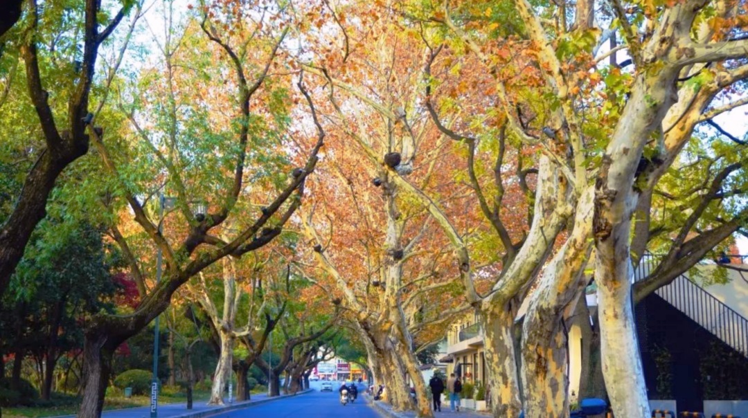 两侧枝条蜿蜒至天际交叉,轻风吹起秋叶沙沙低语,落叶翩跹,阳光透在地上撒落点滴斑驳,诉说着一代又一代松江人的故事。