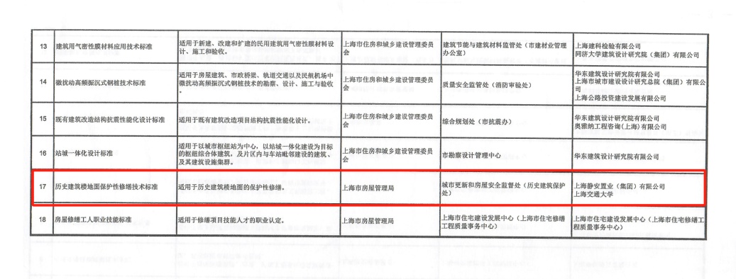 2024年12月27日,静安置业集团与上海交通大学联合主编的《历史建筑楼地面保护性修缮技术标准》,正式被纳入上海市住房和城乡建设管理委员会批准的2025年上海市工程建设规范及地方标准编制计划。