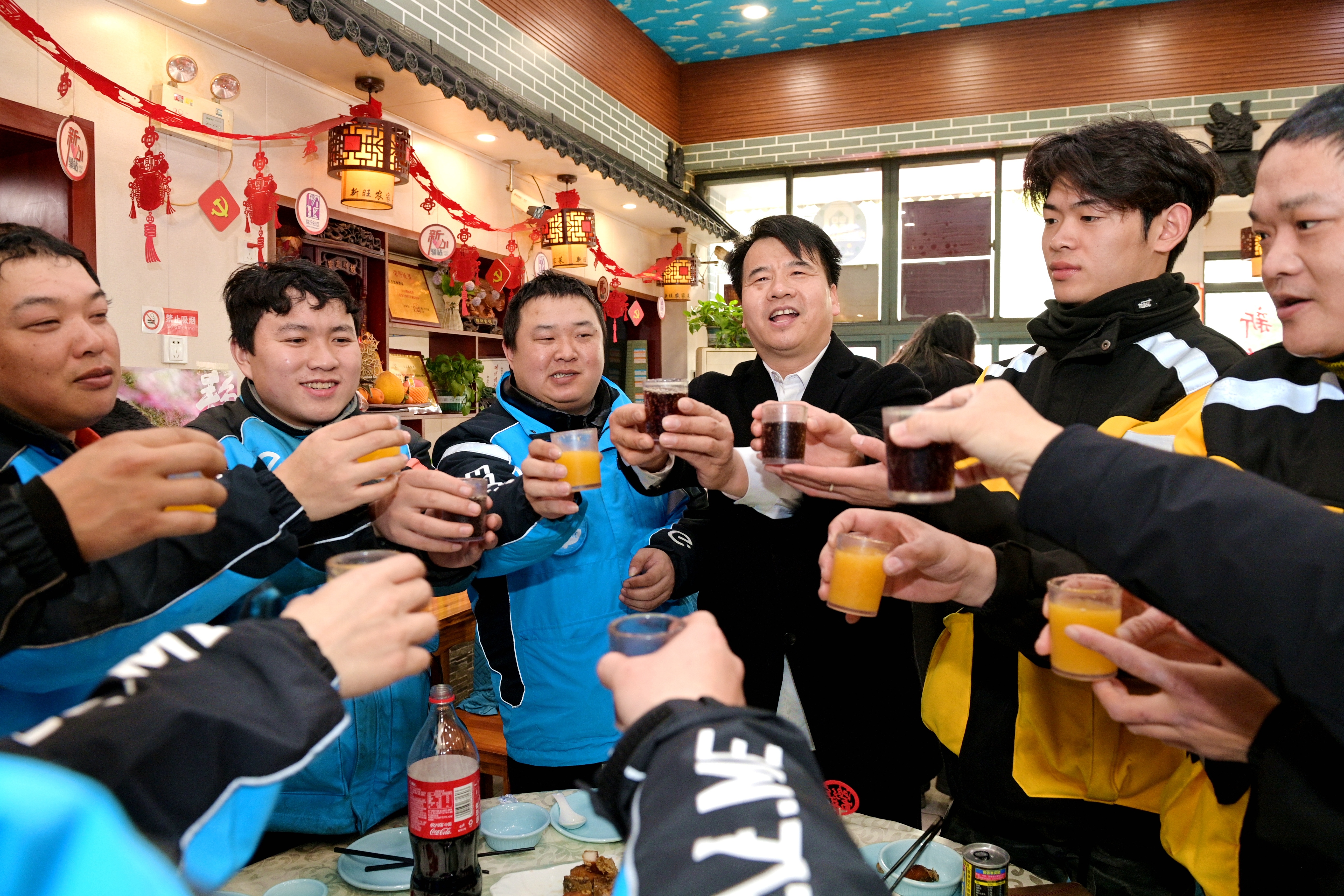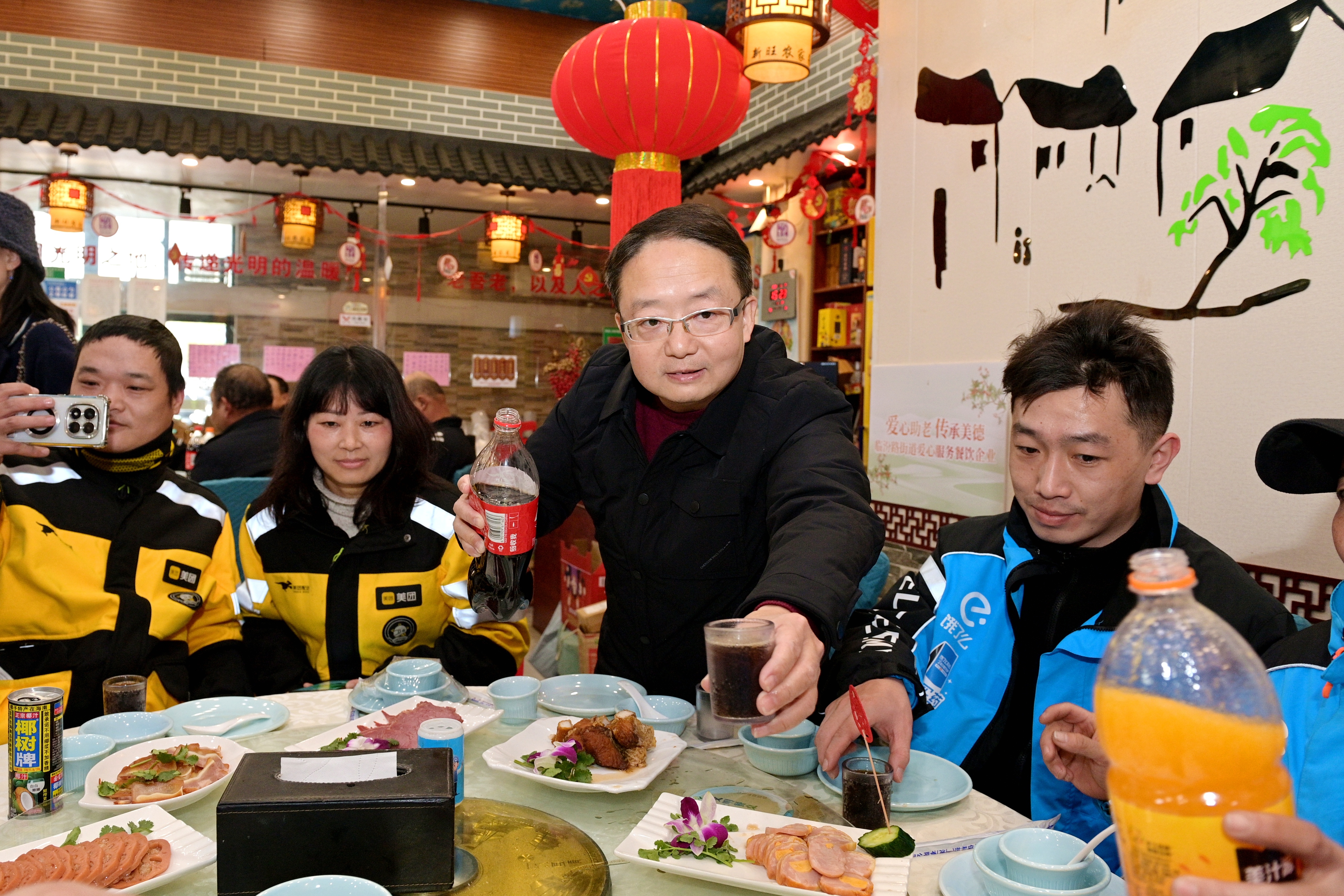 “新年快乐!”“吃饭喽!”1月23日,一场充满温情的新春佳宴在位于岭南路上的新旺美食林热闹开场。来自临汾路街道的40名快递外卖员、市容环卫工作者、滴滴网约车司机等新就业群体代表齐聚一堂,围坐在一起,共享这顿饱含着关怀与温暖的团圆饭,在欢声笑语中提前感受蛇年春节的喜庆氛围。