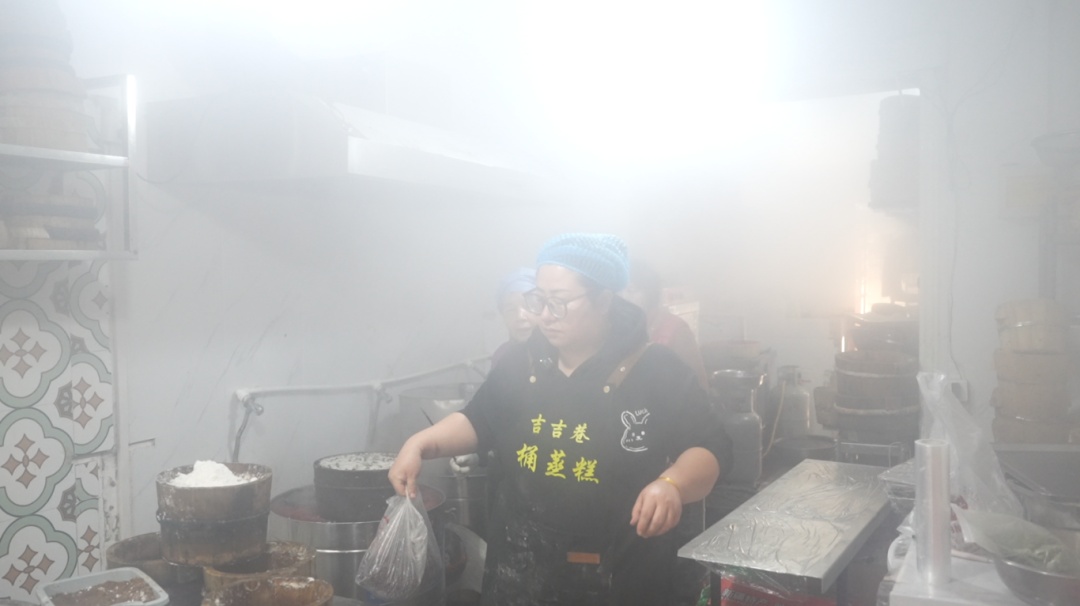 走进“吉吉巷”桶蒸糕店,店里是一片雾气茫茫,空气里好像也有种香甜的味道,过来买糕的市民络绎不绝。大家都想在过年的时候,既饱口福,又讨一个好彩头。