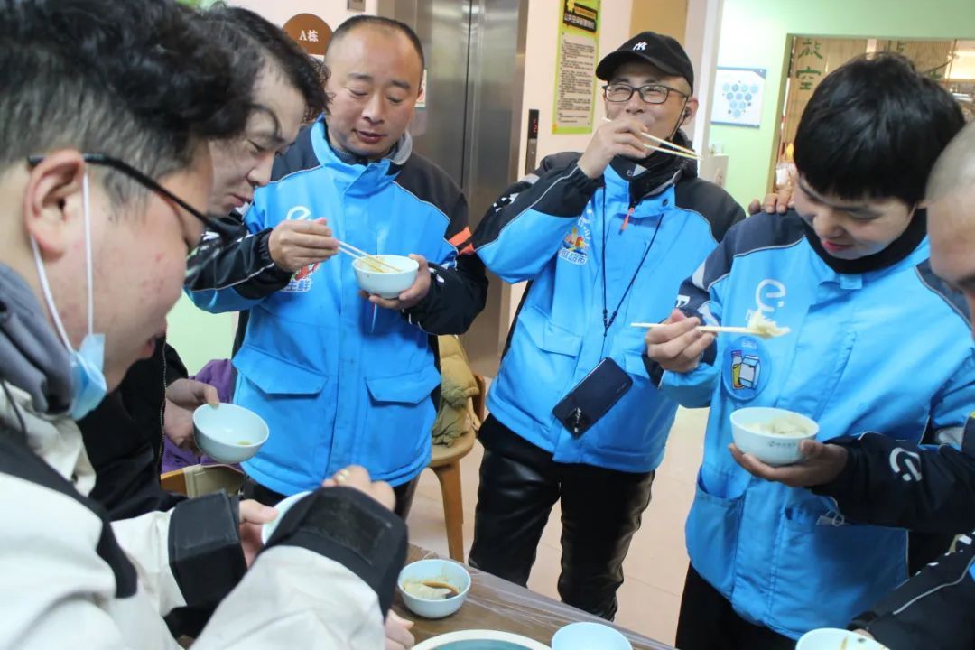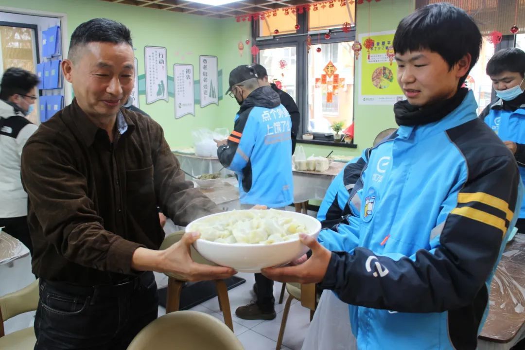 在东滩社区食堂,街区书记、工作人员、新就业群体及家属围坐在一起,擀皮、包馅、捏花边,忙得不亦乐乎。当北方的粗犷遇上南方的精致,当老师傅的传承碰撞新青年的创意,面粉飞扬中竟拼出个“饺子武林大会”。