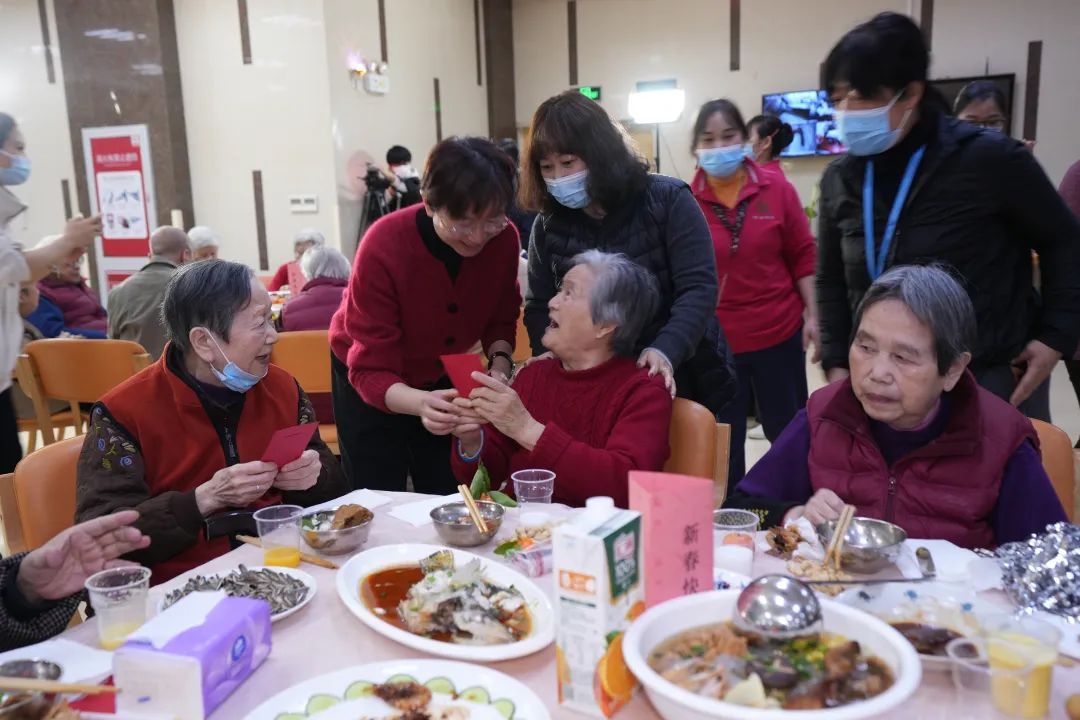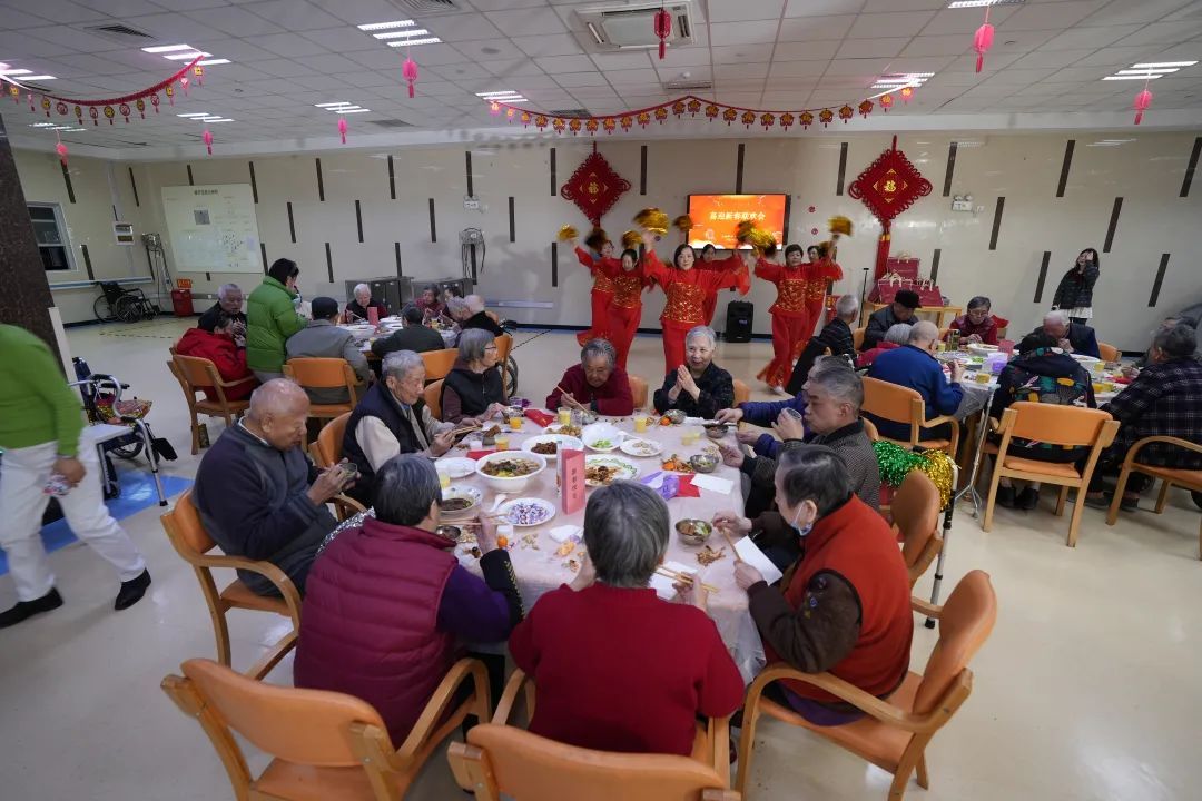 养老院的工作人员精心筹备,为老人和家属们准备了丰盛的年夜饭,让老人们在寒冬里感受到新年的温暖和快乐。