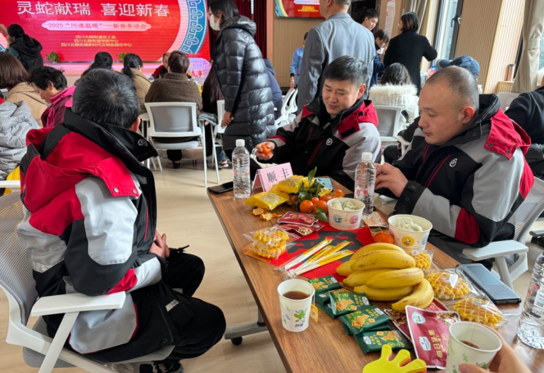 活动现场,街道总工会为今年留沪过年的新就业形态劳动者送上年夜饭礼包和蛇年祝福,诚挚地感谢他们为城市发展作出的贡献。在茶话会环节,新就业形态劳动者们还一起回首2024,展望2025年。