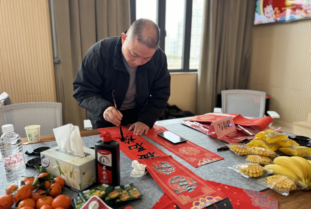 除了包饺子、话家常,现场还开展了写福字对联活动,来自社区里的书法爱好者挥毫泼墨,为新就业形态劳动者免费书写春联和福字,一副副火红的春联和一张张福字伴随着氤氲的墨香,带来了浓浓的年味。