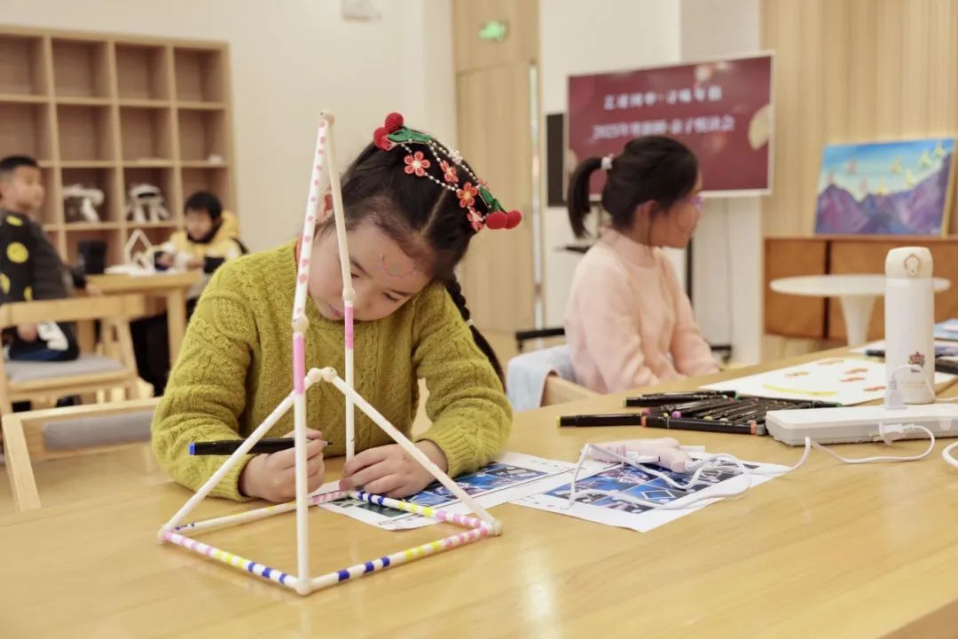 用纸管搭建的天文台、大房子,用绘画形式呈现的成语“事事如意”“丰富多彩”……经过一个多小时的努力,孩子们的作品逐一呈现,充满想象力的作品让人眼前一亮。吴霈暄和妈妈一起参加了活动,和他平时在家做的亲子手工不同的是,这次的活动以不同材料出发,完全让孩子们进行自由发挥,充分考验了孩子的创造力。吴霈暄高兴地说:“我对自己的作品很满意,今天很开心,下次我还要来!”