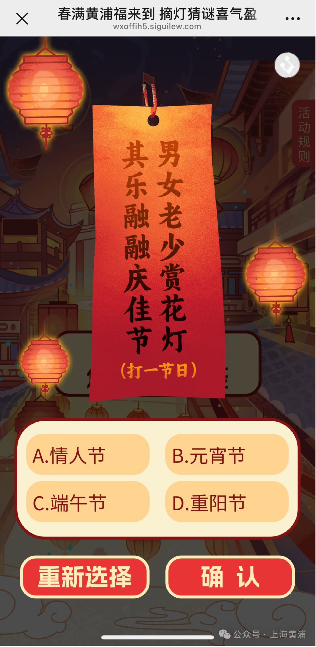 确认灯笼后,会出现一个灯谜,选择你认为正确的答案。若觉得灯谜有点难,可以点击“重新选择”按钮,换一道题试试。