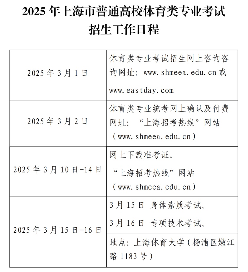 (一)文化考试 参加2025年上海市普通高校统一高考。具体安排以市教育考试院公布为准。 (二)专业统考 时间:2025年3月15日(星期六,身体素质考试)、3月16日(星期日,专项技术考试) 地点:上海体育大学(杨浦区嫩江路1183号) 凡报考体育类专业的考生(含体育教育、休闲体育、社会体育指导与管理等),均须参加专业统考。所有统考项目均按该项目的体育竞赛规则执行。考生须按照本人准考证上规定时间和要求准时参加专业统考,迟到15分钟以上者取消本次专业统考的考试资格。 1.考试项目:包括身体素质和专项技术两大项。总分值为100分。 (1)身体素质考试: 含100米跑、原地推铅球、800米跑三门科目(考生每门科目均须参加,每门科目满分25分,共计75分) (2)专项技术考试: 含田径、篮球、排球、足球、网球、羽毛球、乒乓球、体操、武术、游泳等十门科目。 考生可按本人专长、报考院校的招生要求和规定,选择具体的科目(考生每人限选一门科目,满分25分)。 2.准考证下载 时间:2025年3月10日-14日(星期一至星期五) 方式:考生通过“上海招考热线”网站(www.shmeea.edu.cn)自行下载并打印《2025年上海市普通高校招生体育类专业统考准考证》。 (三)其他 除体育类专业统考外,报考2025年普通高校运动训练、武术与民族传统体育专业招生考试的考生,须另行登录国家体育总局的中国运动文化教育网(http://www.ydyeducation.com)完成考试报名和缴费手续,并按照相关要求参加文化考试和体育专项考试,具体详见中国运动文化教育网。 考生若被运动训练、武术与民族传统体育专业录取,则不再参加后续各项普通高校考试招生的录取(包括体育类专业考试招生、高水平运动队等)。