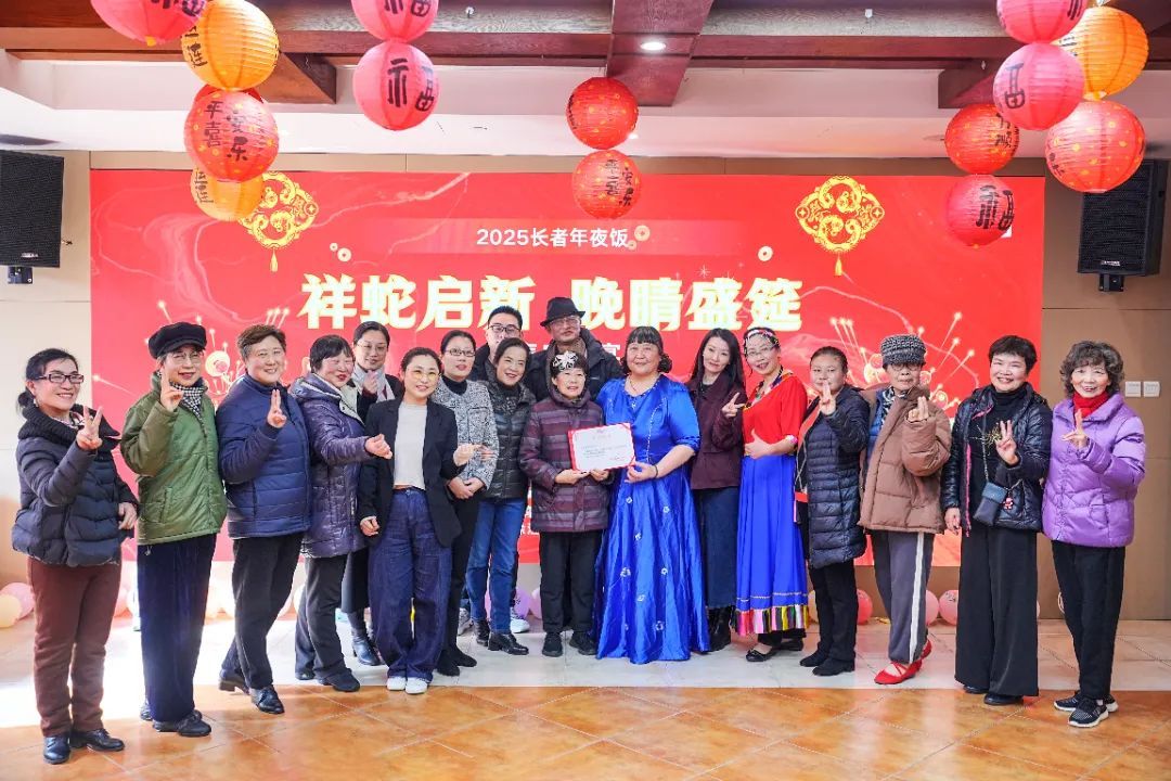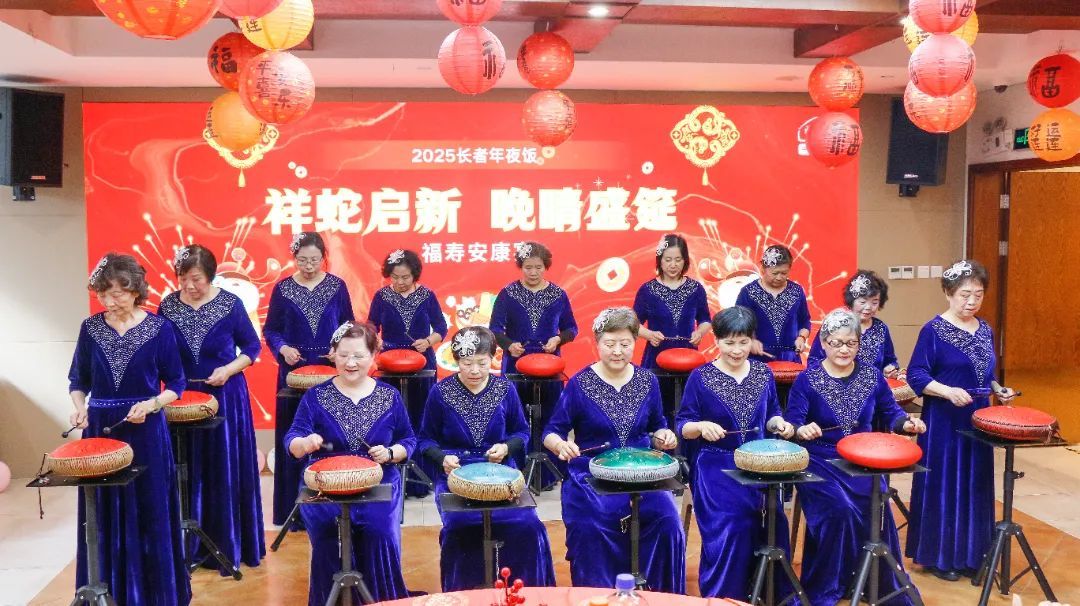 随着一阵悠扬的鼓乐声响起,三福院的“祥蛇启新 晚晴盛筵”2025年长者年夜饭拉开了帷幕,近百位老人共聚在多功能厅中,四处张灯结彩,充满了喜庆的年味。活动现场的演出节目都由华泾镇群艺团体“常乐艺术团”的老人们表演,内容包括舞蹈、合奏、沪剧等多种形式。