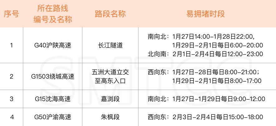 截至1月27日14时,全路网缓行路段有:G1503高东入口后方缓行3公里,G1503外圈沪崇苏立交后方缓行2公里。