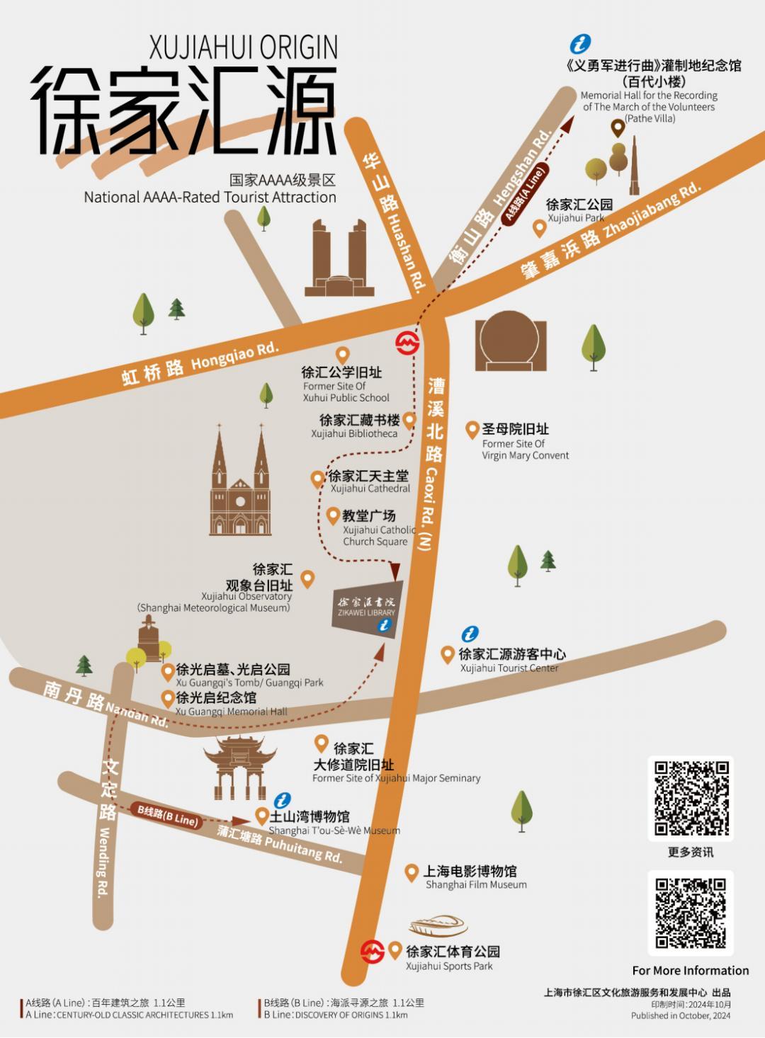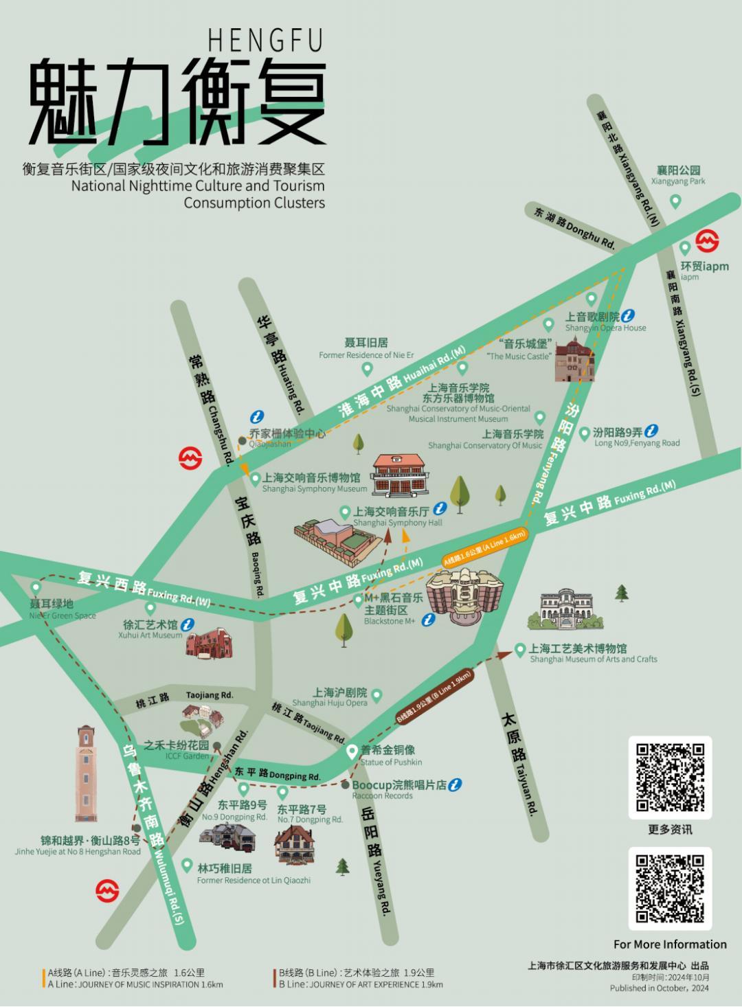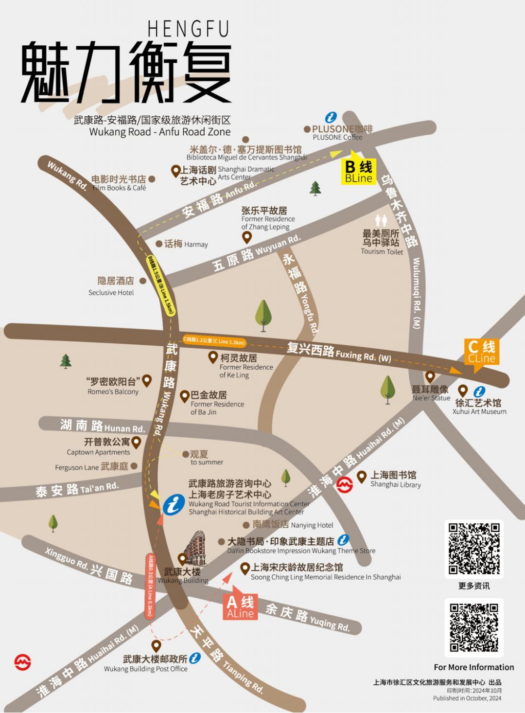 中心依据区域特色和入境游客的特点,设计了涵盖衡复武安街区等5个板块的中英双语单页。游客们只需“一页在手”扫描单页二维码,即可获取双语版本的景点介绍及开放信息,深入了解衡复风貌区历史人文底蕴和街区活力。
