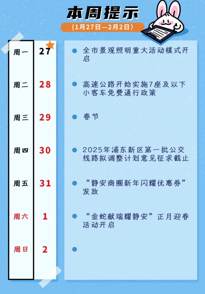 1月28日起高速公路免收小客车通行费、假期上海各类活动精彩纷呈、大量招聘进行中……本周还有哪些大事?速看本周提示↓