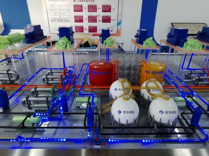 在项目展示厅,一组模型简单说明了技术原理。模型用管道内跳跃前行的光点模拟空气,空气通过管道经历三次压缩,从常温常压压缩至17.3MPa,储存进地下的巨大盐穴中,成为一个巨大的“空气充电宝”。