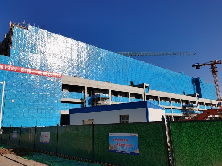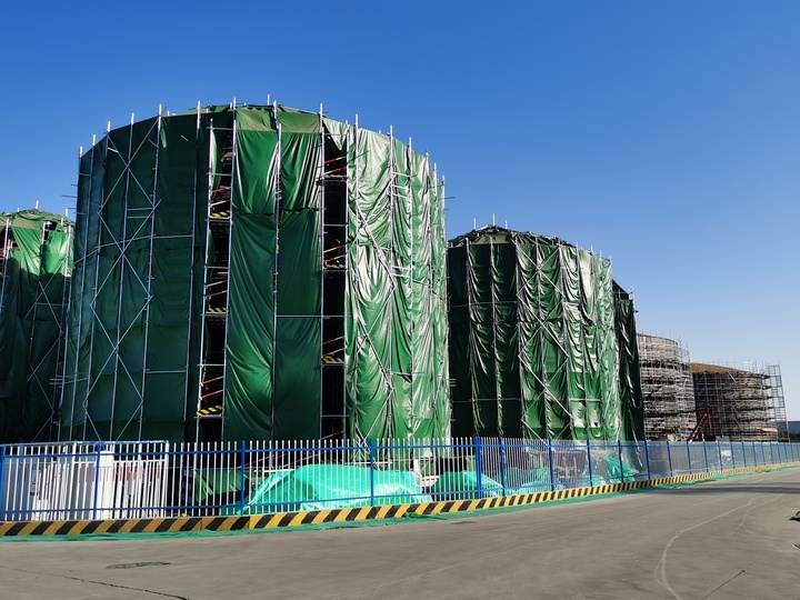 走进项目核心区,主厂房已完成土建施工,进入设备安装阶段。主厂房北侧,巨大的盐储罐和水球罐高高耸立。空气压缩过程中产生的热能并不会浪费,将通过管道分别回收储存在这里。