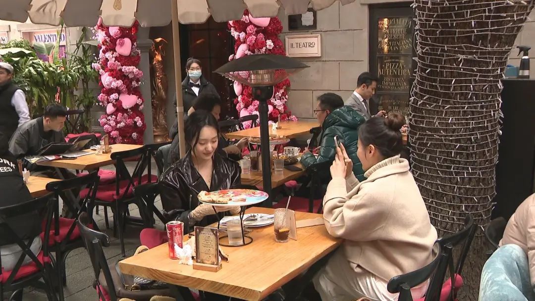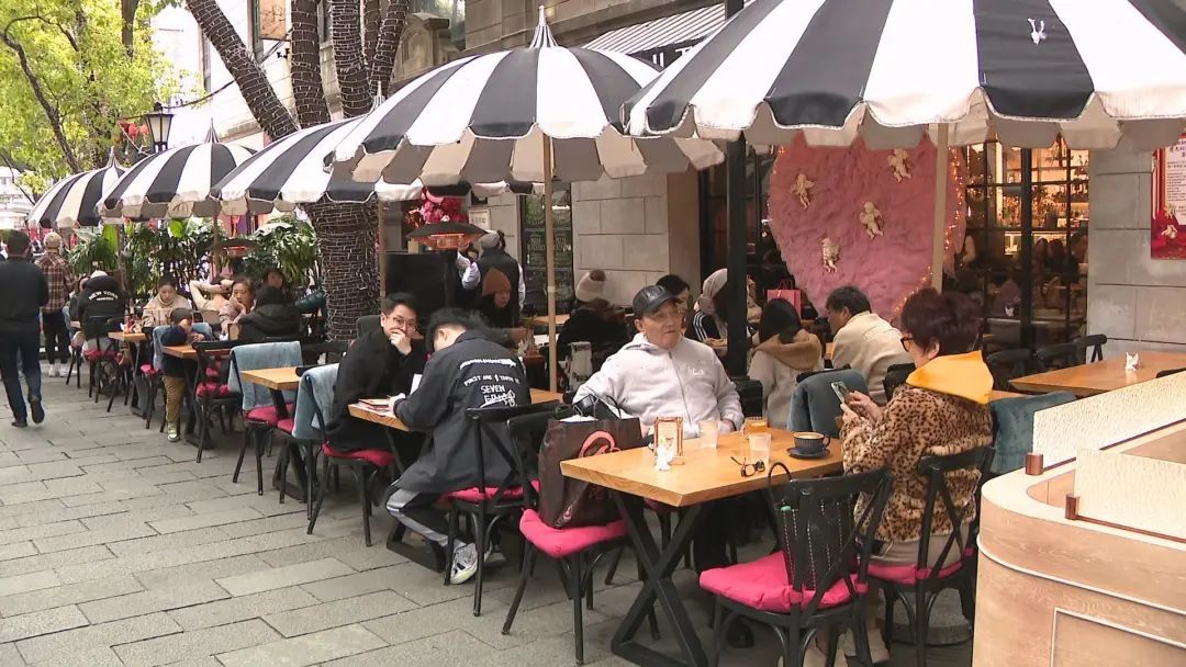 商户的外摆位上,已经坐满了市民游客,一对老夫妇点了一份咖啡和饮料,相互间享受这难得的惬意。“今天觉得天蛮好,就到新天地坐坐,这里的新年味很足,氛围相当好,布置得很漂亮。”潘阿姨一脸幸福,“上海其实有很多很灵的地方,我们经常会去看看逛逛。”