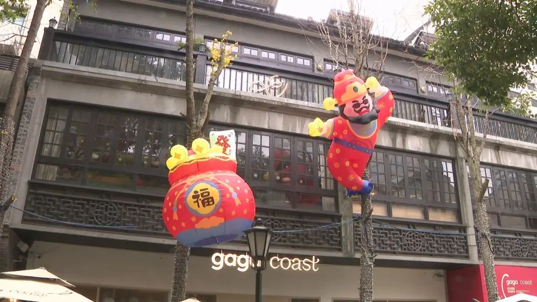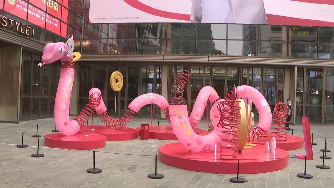 而在新天地喷水池广场旁,喜庆卡通的财神与灵动的福字在空中闪耀,欢迎着来自四面八方的市民游客。市民陈女士告诉记者,“看到这些艺术装置,新年将至的感觉就有了。这些蛇的生肖的装置很有趣,很喜庆。”