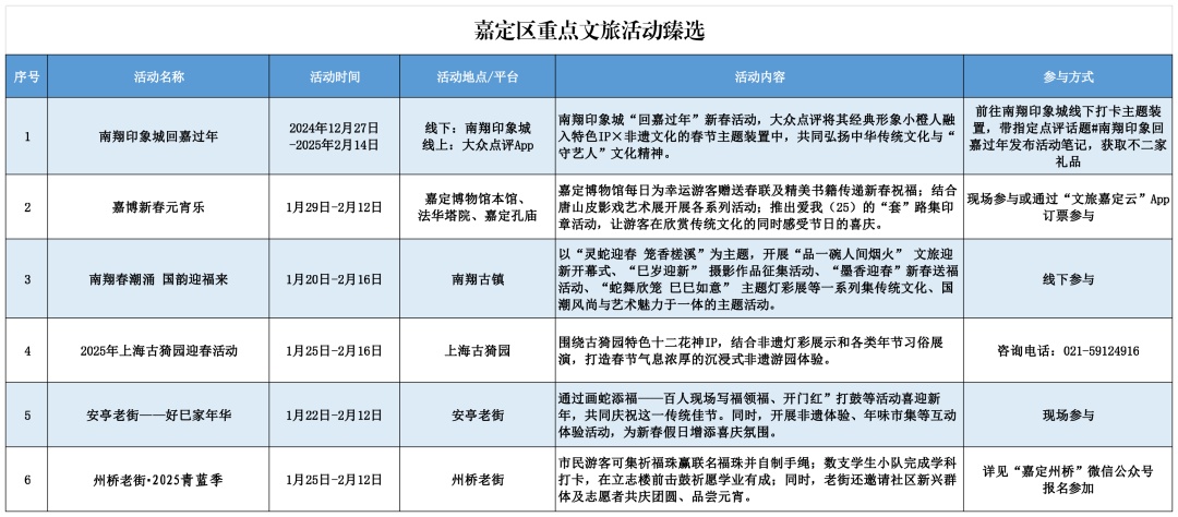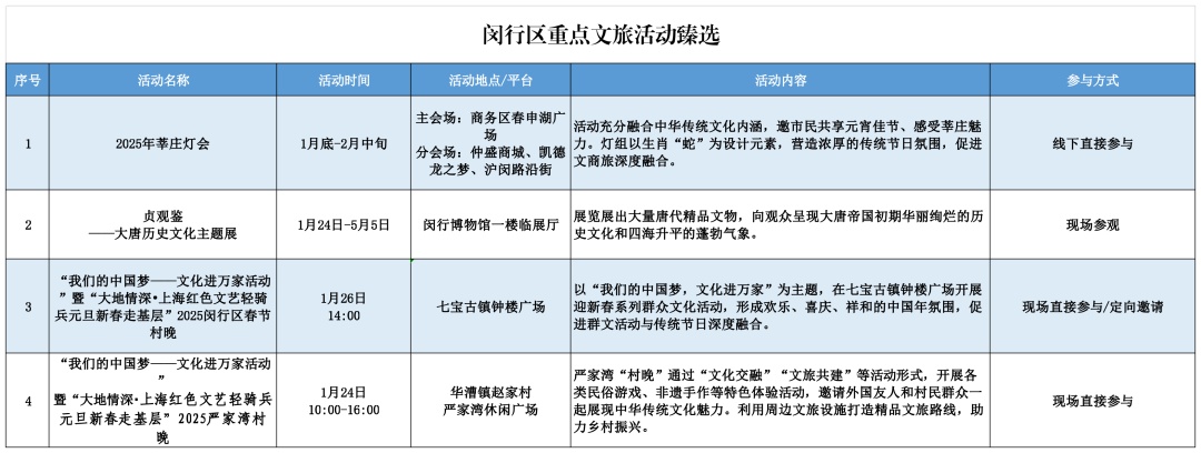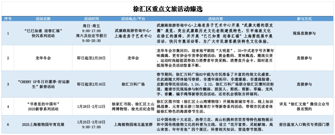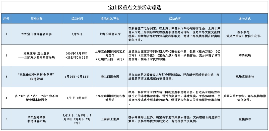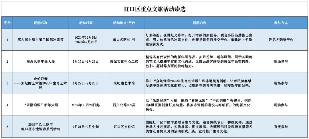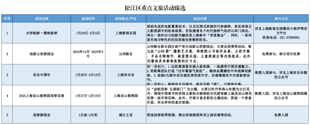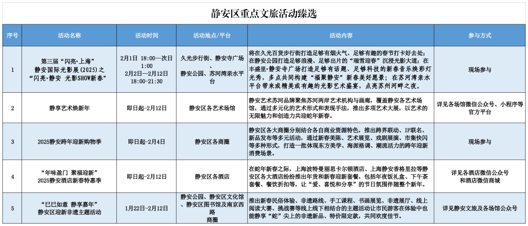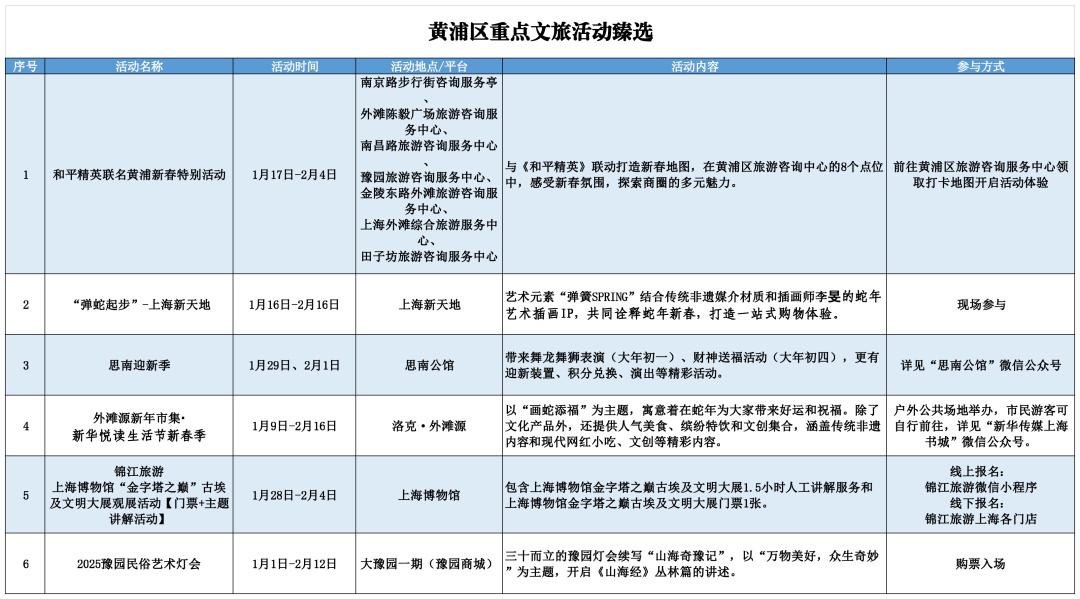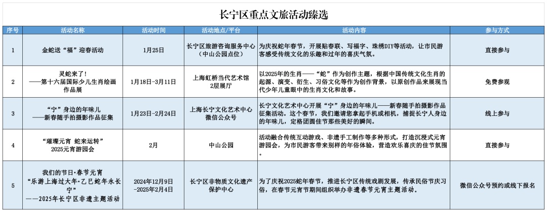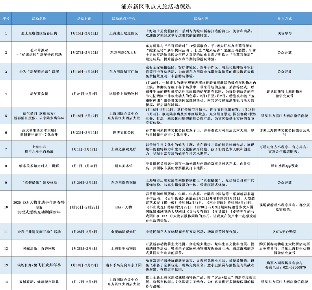 在新春佳节到来之际,上海将举办各类精彩丰富的文旅活动,欢迎海内外游客来上海,感受上海都市旅游的文化内涵,开启蛇年的美好生活。春节期间,本市将集中推出127项重点活动,详见: 活动名称:迪士尼度假区新春庆典 活动时间:1月15日-2月14日 活动地点/平台:上海迪士尼度假区 活动内容:上海迪士尼度假区以一系列专为蛇年新春打造的演出、美食和商品,欢迎游客来到这里度过难忘的团圆时光。 参与方式:现场参与 活动名称:毛茸茸派对——“蛇来运转”新年快闪活动 活动时间:1月27日-2月12日 活动地点/平台:东方明珠0米大厅 活动内容:东方明珠与“毛茸茸派对”IP强强联合,于0米大厅举办毛茸茸派对——“蛇来运转”新年快闪活动 ,打造“蛇来运转”主题互动装置、年味十足的互动游乐区及年轻人喜爱的治愈系东方明珠ד毛茸茸派对”限定玩具,提升游客在春节期间的游玩体验。 参与方式:公众开放 活动名称:灵蛇启新,百兽同庆 活动时间:1月28日-2月4日 活动地点/平台:上海野生动物园 活动内容:开展新春动物萌主大比拼、贪吃蛇大比拼、蛇年生肖文化科普展、投福纳财等活动,吸引亲子家庭和动物朋友近距离互动,通过游戏的方式共同过个欢乐的春节。 参与方式:购买新春动物萌主大比拼活动票后免费参与,详见上海野生动物园微信公众号 活动名称:2025豫园民俗艺术灯会 活动时间:1月1日-2月12日 活动地点/平台:大豫园一期(豫园商城) 活动内容:三十而立的豫园灯会续写“山海奇豫记”,以“万物美好,众生奇妙”为主题,开启《山海经》丛林篇的讲述。 参与方式:购票入场 活动名称:和平精英联名黄浦新春特别活动 活动时间:1月17日-2月4日 活动地点/平台:南京路步行街咨询服务亭、外滩陈毅广场旅游咨询服务中心、南昌路旅游咨询服务中心、豫园旅游咨询服务中心、金陵东路外滩旅游咨询服务中心、上海外滩综合旅游服务中心、田子坊旅游咨询服务中心、大世界旅游咨询服务中心 活动内容:与《和平精英》联动打造新春地图,在黄浦区旅游咨询中心的8个点位中,感受新春氛围,探索商圈的多元魅力。 参与方式:前往黄浦区旅游咨询服务中心领取打卡地图开启活动体验 活动名称:锦江旅游 上海博物馆“金字塔之巅”古埃及文明大展观展活动【门票+主题讲解活动】 活动时间:1月28日-2月4日 活动地点/平台:上海博物馆 活动内容:包含上海博物馆金字塔之巅古埃及文明大展1.5小时人工讲解服务和上海博物馆金字塔之巅古埃及文明大展门票1张。 参与方式:线上报名(锦江旅游微信小程序),线下报名(锦江旅游上海各门店) 活动名称:“巳巳如意 迎春汇福”快闪系列活动 活动时间:周日-周五9:00-17:00周六及法定节假日9:00-20:30 活动地点/平台:武康路旅游咨询中心·上海老房子艺术中心 活动内容:武康路旅游咨询中心·上海老房子艺术中心开展“武康大楼的朋友圈”展览,突出武康路历史文化老街建筑特色,引申海派文化在徐汇的演绎。并开展“巳巳如意 迎春汇福”上海剪纸展中展活动、快闪市集活动等,为广大市民游客提供特色文化体验。 参与方式:现场直接参与 活动名称:“书香里的中国年”2025新春系列活动 活动时间:1月28日-2月12日 活动地点/平台:徐家汇书院、徐汇区土山湾博物馆、徐光启纪念馆 活动内容:徐汇区图书馆(徐汇区土山湾博物馆)开展海派城市考古、线上知识挑战赛、元宵喜乐游三馆集章打卡等新春系列活动,带领市民读者体验徐汇特色的海派春节生活。 参与方式:详见“徐汇文旅”微信公众号报名预约 活动名称:2025上海植物园年宵花展 活动时间:1月25日-2月16日9:00-17:00 活动地点/平台:上海植物园南北温室群 活动内容:以中国传统十大名花、热带兰花、高山杜鹃和苦苣苔等特色植物展示和中国传统植物文化的科普为主线,设立“花开富贵、灵蛇献瑞、高山来客、年年有鱼”四个展区,科普相关知识,营造春节氛围。 参与方式:前往温室入口购买专类园门票 活动名称:灵蛇来了!——第十六届国际少儿生肖绘画作品展 活动时间:1月18日-3月11日 活动地点/平台:上海虹桥当代艺术馆2层展厅 活动内容:以2025年的生肖——“蛇”作为创作主题,根据中国传统文化生肖的起源、演变、衍生、习俗文化等作为创作背景,以原创作品来展现当代少年儿童眼中的生肖文化和故事。 参与方式:免费参观 活动名称:“璀璨元宵 蛇来运转”2025元宵游园会 活动时间:2月 活动地点/平台:中山公园 活动内容:活动融合传统互动游戏、非遗手工制作等多种形式,打造沉浸式元宵游园会,为市民游客带来别样的年俗体验,营造欢乐喜庆的佳节氛围。 参与方式:直接参与 活动名称:我们的节日·春节元宵“乐游上海过大年·乙巳蛇年永长宁”——2025年长宁区非遗主题活动 活动时间:即日起-2月4日 活动地点/平台:长宁区非物质文化遗产保护中心 活动内容:为了庆祝2025蛇年春节,推进长宁区传统戏剧发展,传承民俗节庆习俗,在春节元宵节期间组织举办非遗春节元宵主题活动。 参与方式:微信公众号预约或线下报名 活动名称:第三届“闪亮·上海”静安国际光影展(2025)之“闪亮·静安 光影SHOW新春” 活动时间:2月1日 18:00—次日1:00;2月2日—2月12日 18:00-21:30 活动地点/平台:久光步行街、静安寺广场、静安公园、苏河湾亲水平台 活动内容:将在久光百货步行街打造足够有烟火气、