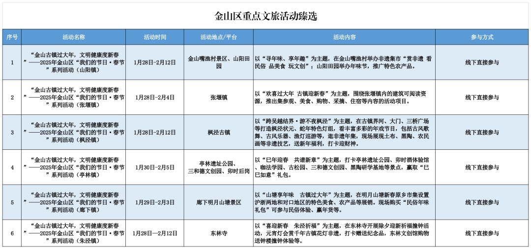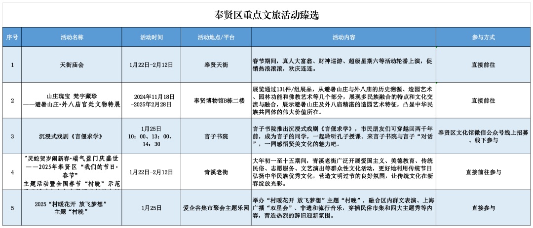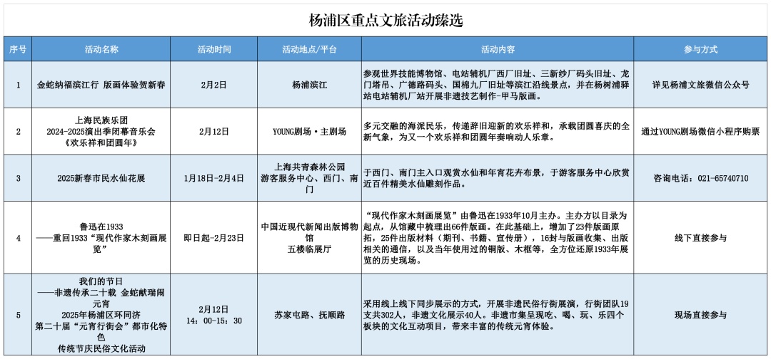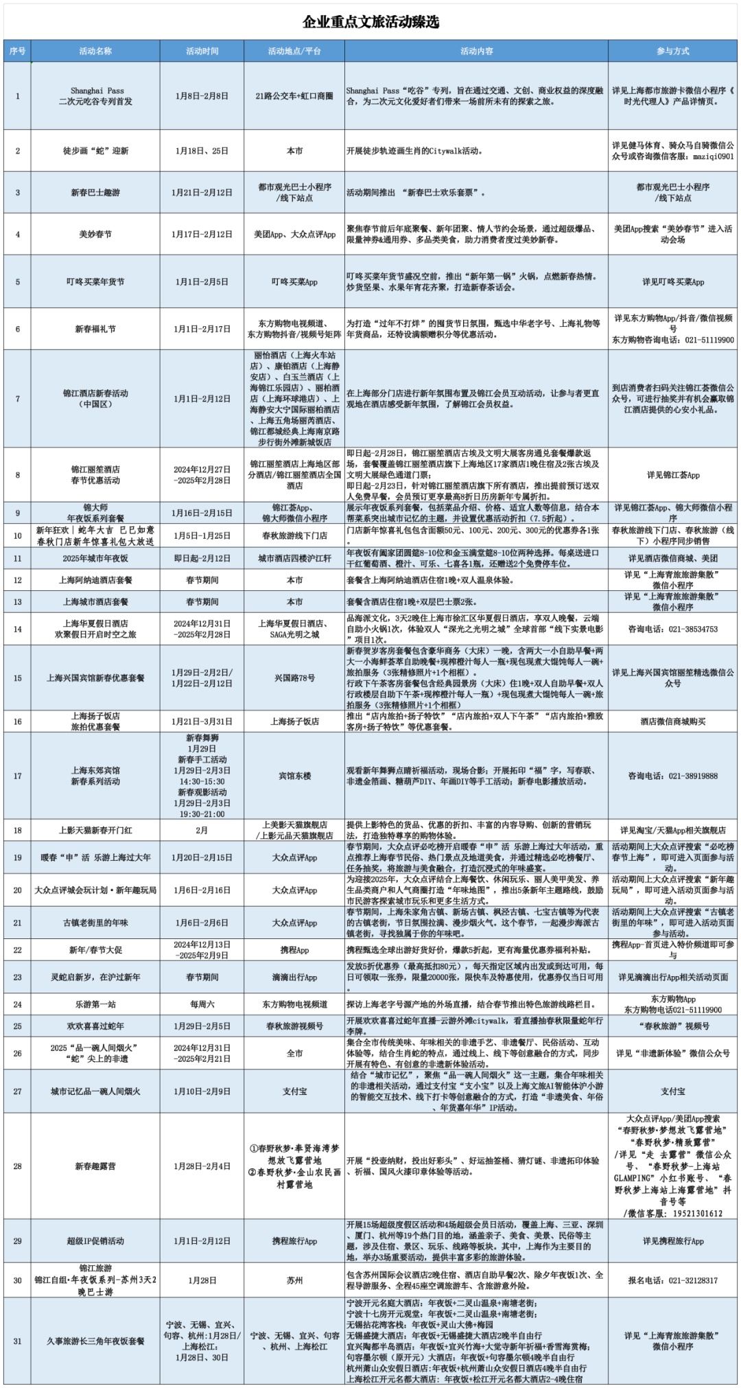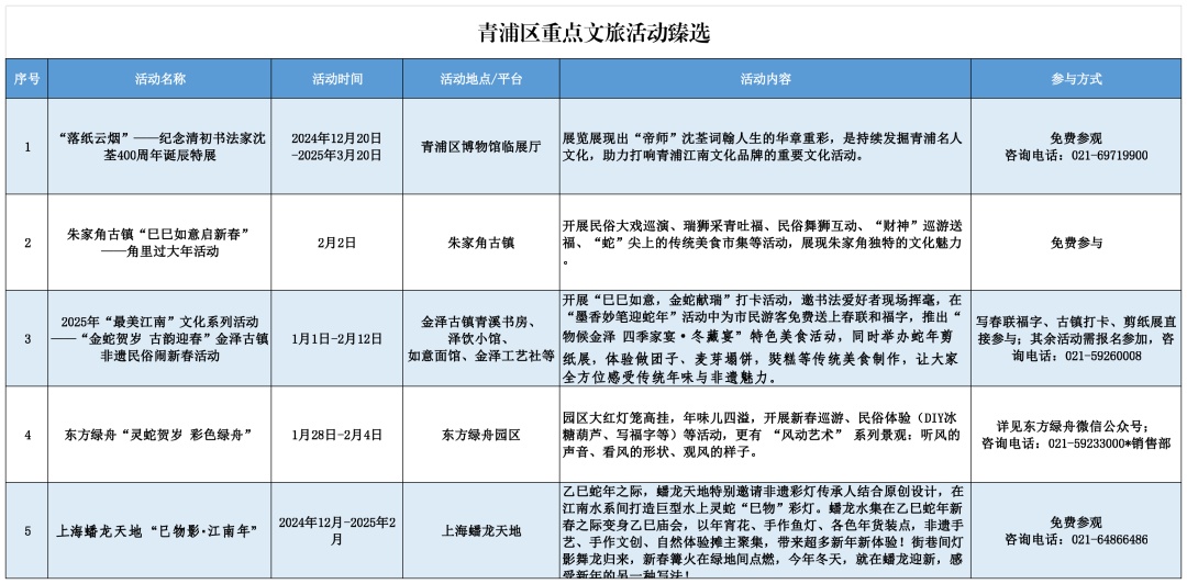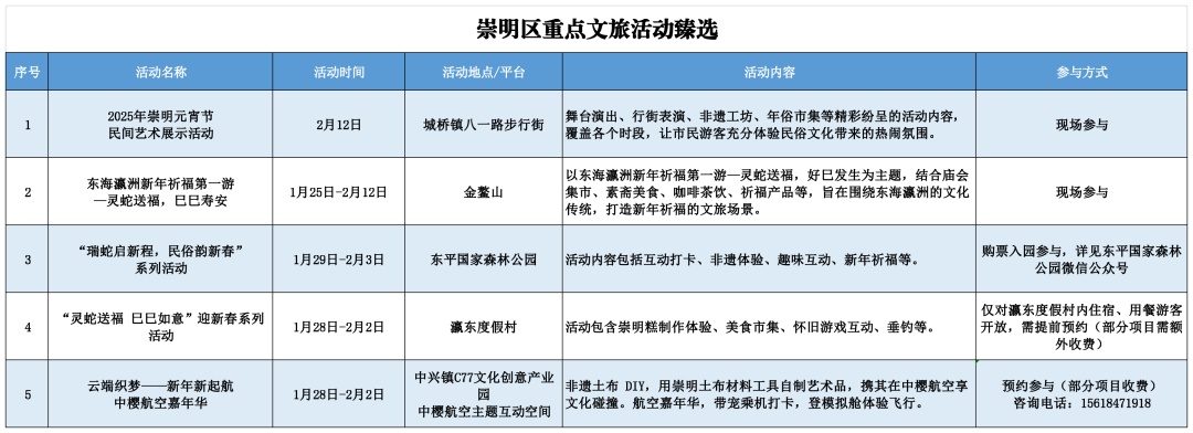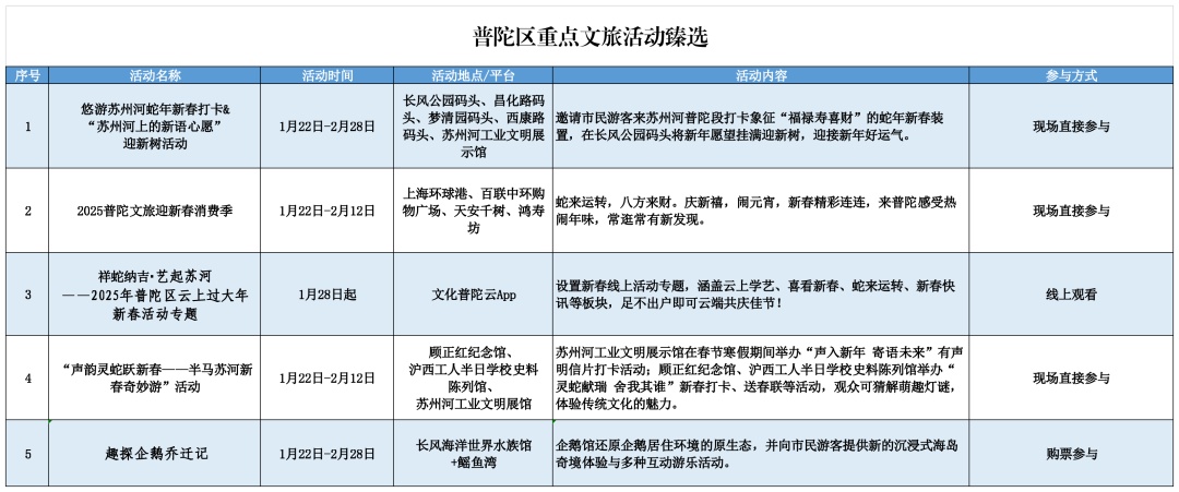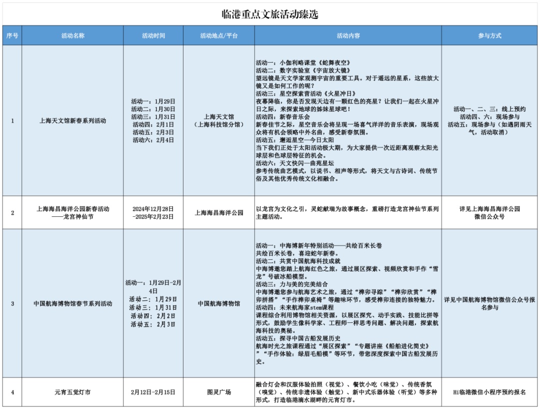 在新春佳节到来之际,上海将举办各类精彩丰富的文旅活动,欢迎海内外游客来上海,感受上海都市旅游的文化内涵,开启蛇年的美好生活。春节期间,本市将集中推出127项重点活动,详见: 活动名称:迪士尼度假区新春庆典 活动时间:1月15日-2月14日 活动地点/平台:上海迪士尼度假区 活动内容:上海迪士尼度假区以一系列专为蛇年新春打造的演出、美食和商品,欢迎游客来到这里度过难忘的团圆时光。 参与方式:现场参与 活动名称:毛茸茸派对——“蛇来运转”新年快闪活动 活动时间:1月27日-2月12日 活动地点/平台:东方明珠0米大厅 活动内容:东方明珠与“毛茸茸派对”IP强强联合,于0米大厅举办毛茸茸派对——“蛇来运转”新年快闪活动 ,打造“蛇来运转”主题互动装置、年味十足的互动游乐区及年轻人喜爱的治愈系东方明珠ד毛茸茸派对”限定玩具,提升游客在春节期间的游玩体验。 参与方式:公众开放 活动名称:灵蛇启新,百兽同庆 活动时间:1月28日-2月4日 活动地点/平台:上海野生动物园 活动内容:开展新春动物萌主大比拼、贪吃蛇大比拼、蛇年生肖文化科普展、投福纳财等活动,吸引亲子家庭和动物朋友近距离互动,通过游戏的方式共同过个欢乐的春节。 参与方式:购买新春动物萌主大比拼活动票后免费参与,详见上海野生动物园微信公众号 活动名称:2025豫园民俗艺术灯会 活动时间:1月1日-2月12日 活动地点/平台:大豫园一期(豫园商城) 活动内容:三十而立的豫园灯会续写“山海奇豫记”,以“万物美好,众生奇妙”为主题,开启《山海经》丛林篇的讲述。 参与方式:购票入场 活动名称:和平精英联名黄浦新春特别活动 活动时间:1月17日-2月4日 活动地点/平台:南京路步行街咨询服务亭、外滩陈毅广场旅游咨询服务中心、南昌路旅游咨询服务中心、豫园旅游咨询服务中心、金陵东路外滩旅游咨询服务中心、上海外滩综合旅游服务中心、田子坊旅游咨询服务中心、大世界旅游咨询服务中心 活动内容:与《和平精英》联动打造新春地图,在黄浦区旅游咨询中心的8个点位中,感受新春氛围,探索商圈的多元魅力。 参与方式:前往黄浦区旅游咨询服务中心领取打卡地图开启活动体验 活动名称:锦江旅游 上海博物馆“金字塔之巅”古埃及文明大展观展活动【门票+主题讲解活动】 活动时间:1月28日-2月4日 活动地点/平台:上海博物馆 活动内容:包含上海博物馆金字塔之巅古埃及文明大展1.5小时人工讲解服务和上海博物馆金字塔之巅古埃及文明大展门票1张。 参与方式:线上报名(锦江旅游微信小程序),线下报名(锦江旅游上海各门店) 活动名称:“巳巳如意 迎春汇福”快闪系列活动 活动时间:周日-周五9:00-17:00周六及法定节假日9:00-20:30 活动地点/平台:武康路旅游咨询中心·上海老房子艺术中心 活动内容:武康路旅游咨询中心·上海老房子艺术中心开展“武康大楼的朋友圈”展览,突出武康路历史文化老街建筑特色,引申海派文化在徐汇的演绎。并开展“巳巳如意 迎春汇福”上海剪纸展中展活动、快闪市集活动等,为广大市民游客提供特色文化体验。 参与方式:现场直接参与 活动名称:“书香里的中国年”2025新春系列活动 活动时间:1月28日-2月12日 活动地点/平台:徐家汇书院、徐汇区土山湾博物馆、徐光启纪念馆 活动内容:徐汇区图书馆(徐汇区土山湾博物馆)开展海派城市考古、线上知识挑战赛、元宵喜乐游三馆集章打卡等新春系列活动,带领市民读者体验徐汇特色的海派春节生活。 参与方式:详见“徐汇文旅”微信公众号报名预约 活动名称:2025上海植物园年宵花展 活动时间:1月25日-2月16日9:00-17:00 活动地点/平台:上海植物园南北温室群 活动内容:以中国传统十大名花、热带兰花、高山杜鹃和苦苣苔等特色植物展示和中国传统植物文化的科普为主线,设立“花开富贵、灵蛇献瑞、高山来客、年年有鱼”四个展区,科普相关知识,营造春节氛围。 参与方式:前往温室入口购买专类园门票 活动名称:灵蛇来了!——第十六届国际少儿生肖绘画作品展 活动时间:1月18日-3月11日 活动地点/平台:上海虹桥当代艺术馆2层展厅 活动内容:以2025年的生肖——“蛇”作为创作主题,根据中国传统文化生肖的起源、演变、衍生、习俗文化等作为创作背景,以原创作品来展现当代少年儿童眼中的生肖文化和故事。 参与方式:免费参观 活动名称:“璀璨元宵 蛇来运转”2025元宵游园会 活动时间:2月 活动地点/平台:中山公园 活动内容:活动融合传统互动游戏、非遗手工制作等多种形式,打造沉浸式元宵游园会,为市民游客带来别样的年俗体验,营造欢乐喜庆的佳节氛围。 参与方式:直接参与 活动名称:我们的节日·春节元宵“乐游上海过大年·乙巳蛇年永长宁”——2025年长宁区非遗主题活动 活动时间:即日起-2月4日 活动地点/平台:长宁区非物质文化遗产保护中心 活动内容:为了庆祝2025蛇年春节,推进长宁区传统戏剧发展,传承民俗节庆习俗,在春节元宵节期间组织举办非遗春节元宵主题活动。 参与方式:微信公众号预约或线下报名 活动名称:第三届“闪亮·上海”静安国际光影展(2025)之“闪亮·静安 光影SHOW新春” 活动时间:2月1日 18:00—次日1:00;2月2日—2月12日 18:00-21:30 活动地点/平台:久光步行街、静安寺广场、静安公园、苏河湾亲水平台 活动内容:将在久光百货步行街打造足够有烟火气、