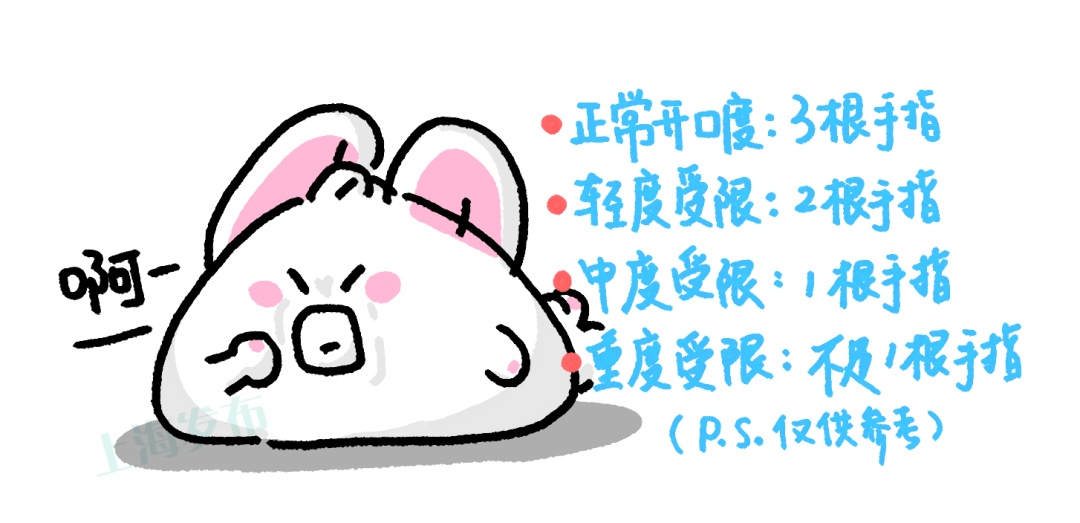 1、中重度张口受限:若出现张口度不断减小,一般降低至30mm以下,尽快去医院就诊。