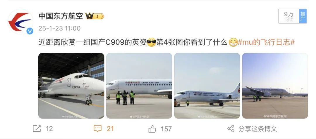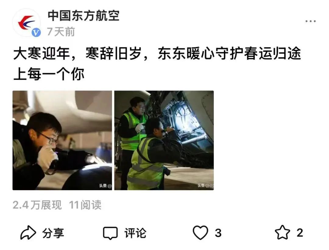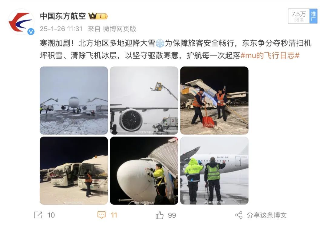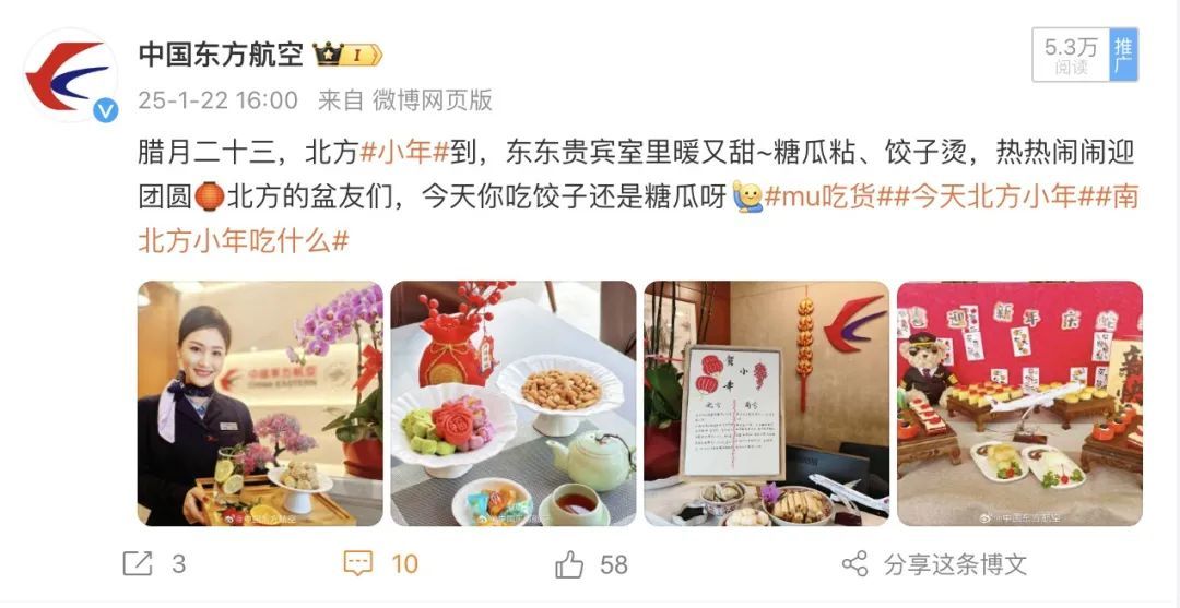 微博共发布43条内容,总流量154.5万。其中,“腊月二十三,北方小年到,东东贵宾室里暖又甜~糖瓜粘、饺子烫,热热闹闹迎团圆,北方的盆友们,今天你吃饺子还是糖瓜呀”、“近距离欣赏一组国产C909的英姿,第4张图你看到了什么”、“寒潮加剧!北方地区多地迎降大雪,为保障旅客安全畅行,东东争分夺秒清扫机坪积雪、清除飞机冰层,以坚守驱散寒意,护航每一次起落”获得了更多的曝光量。