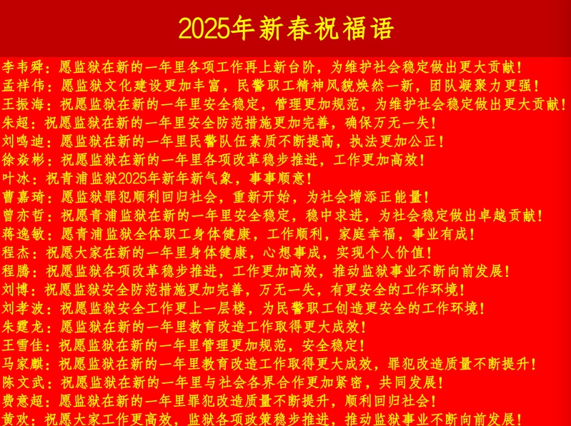 民警们写下新春祝福语,一句句真挚的话语,传递着对同事们的美好祝愿,对监狱高质量发展的坚定信心,展现了监狱民警团结一心、积极向上的精神面貌。