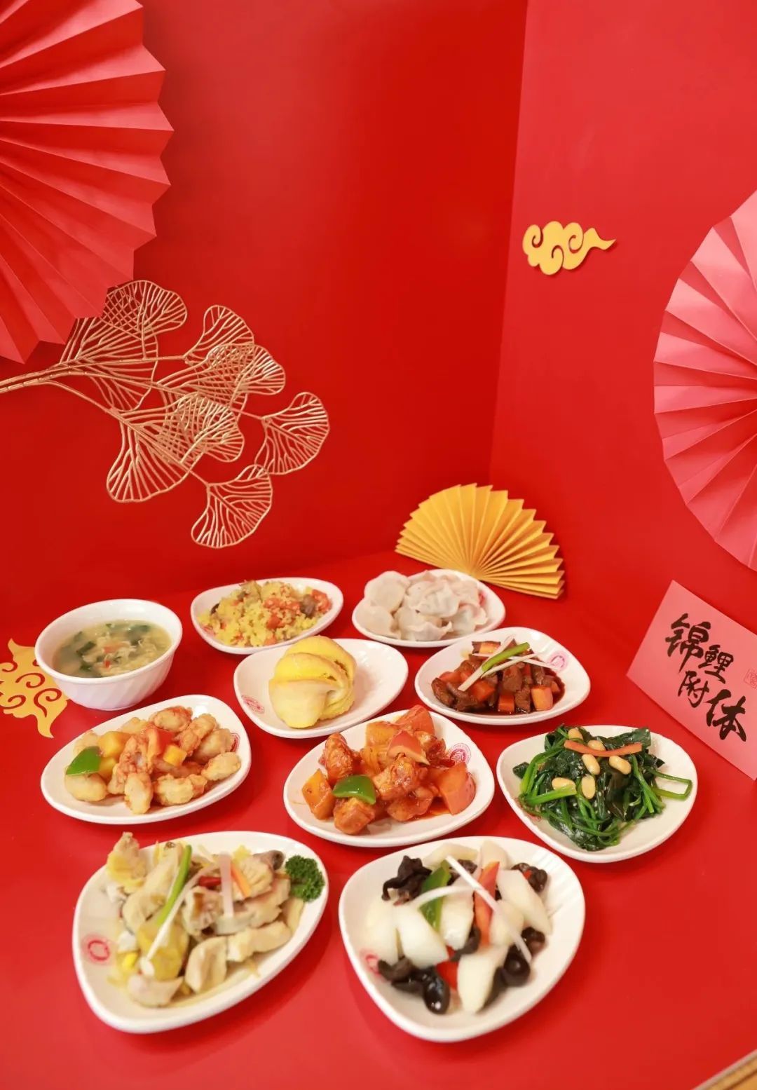 B套餐:蚝油牛柳、三色炒鱼丁、香炸猪排、清炒塔菜、青椒土豆丝、鲜滑罗宋汤、米饭、酸奶一杯