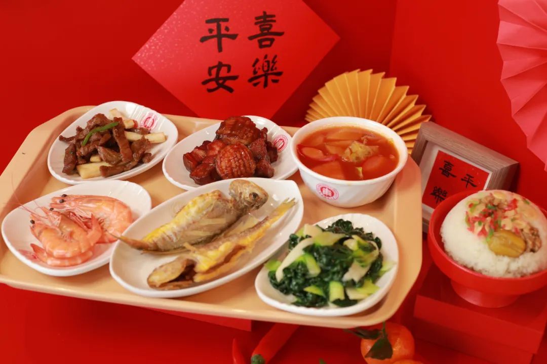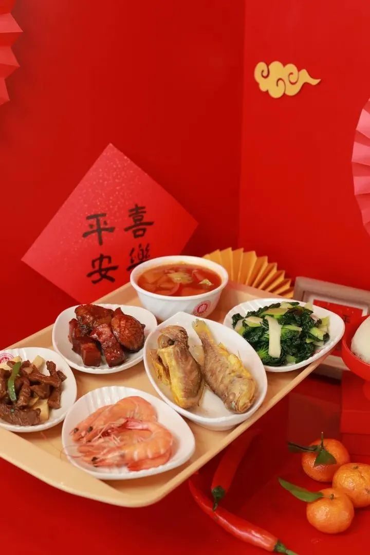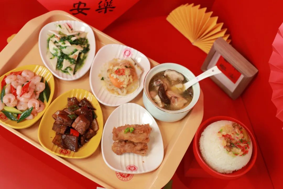 A套餐:油爆大虾、红烧大肉、糟溜黑鱼片、四喜烤麸、蒜香杭白菜、鲜滑罗宋汤、米饭、苹果一只