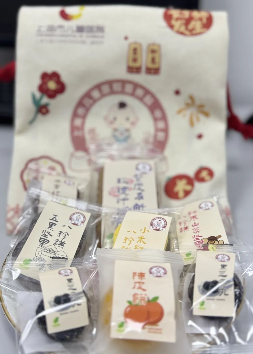 在精心准备的福袋中,各种口味八珍糕、紫皮石斛玫瑰纤维饼、芝麻丸、陈皮饼等特色食品格外引人注目,美味可口的同时,也凝聚了对儿童健康的呵护。这些食品均由上海市儿童医院营养科与中医科携手打造,融合了上海市静安区非物质文化遗产——蔚童医术的精髓,并结合现代营养学理念,严格遵循“药食同源”的传统原则。
