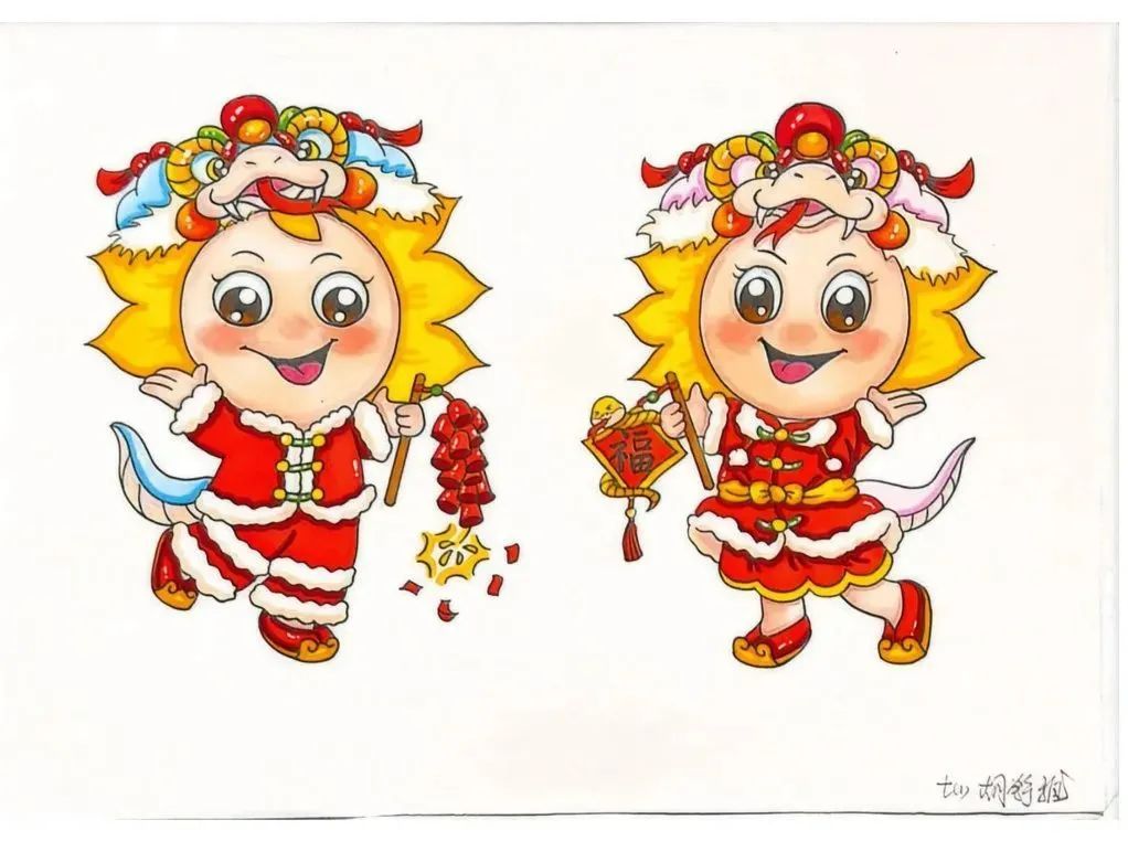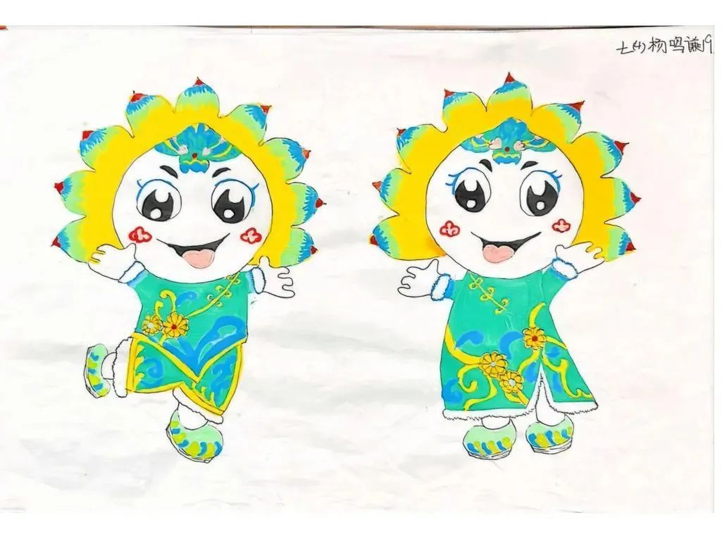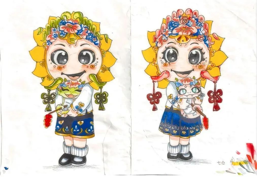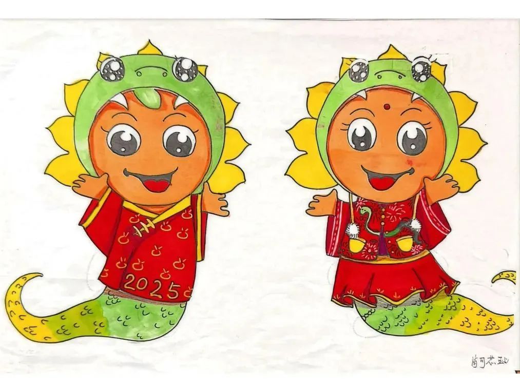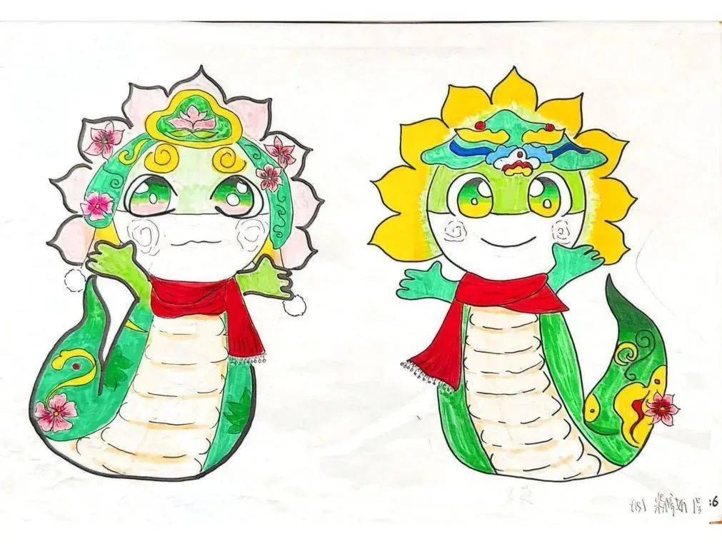 设计过程中,“小小设计师”们脑洞大开,掀起创意风暴。蛇身纹理、马面裙、簪花等元素,都在设计中灵活运用。俞璐茜设计的吉祥物“葵葵”“园园”成为“国风代言人”。简约大气的蓝白色马面裙,搭配清新簪花头饰,怀抱里的小蛇萌宠俏皮可爱,让人眼前一亮。学生胡舒雅笔下的吉祥物头戴蛇头帽,身着大红中式服饰,手持鞭炮与福字,喜气满满。柴梓妍笔下的吉祥物为人面蛇身,服饰图案参考了法门寺博物馆收藏的银如意和三星堆博物馆收藏的青铜蛇。“蛇身上通体以绿色为主,既彰显了典雅中国风,又与红色围巾形成鲜明对比,给人强烈的视觉冲击。” 柴梓妍说。