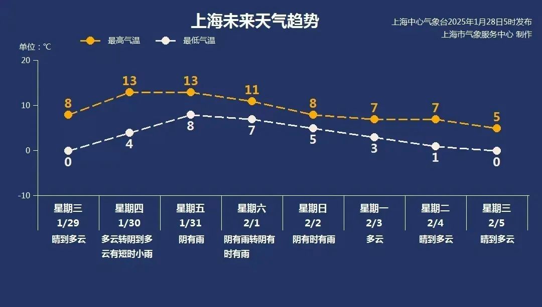 上海中心气象台预计,受地面冷高压控制,未来数日申城天气主打晴冷,气温保持在0~8℃之间。大年初二(1月30日)起,受暖湿气流影响,申城气温回升,同时云系增多;大年初三(1月31日)降水较为明显;大年初六(2月3日)前后受冷空气影响,申城雨止转多云,天气又将转为晴冷,请市民朋友们及时关注最新天气报道。