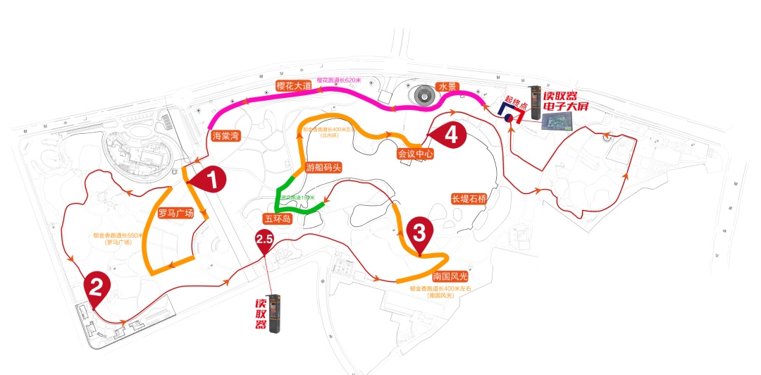 跑道以大宁公园北门作为起终点,途经樱花大道、大宁音乐喷泉、罗马广场、山门阁、蘑菇亭、运动长廊、南国风光、会议中心、白沙滩等园内诸多标志性景点,结合公园“三季有花、四季有景”的特色,专设郁金香、樱花、荷花跑段区域,并与之匹配相应的花道、彩虹线,犹如一条蜿蜒、绚丽的彩带环绕在湖光山色间。同时跑道内搭建智能跑步户外运动物联网平台,为广大市民免费提供多样化的运动服务功能,实现自然风景与科技魅力的有效融合。