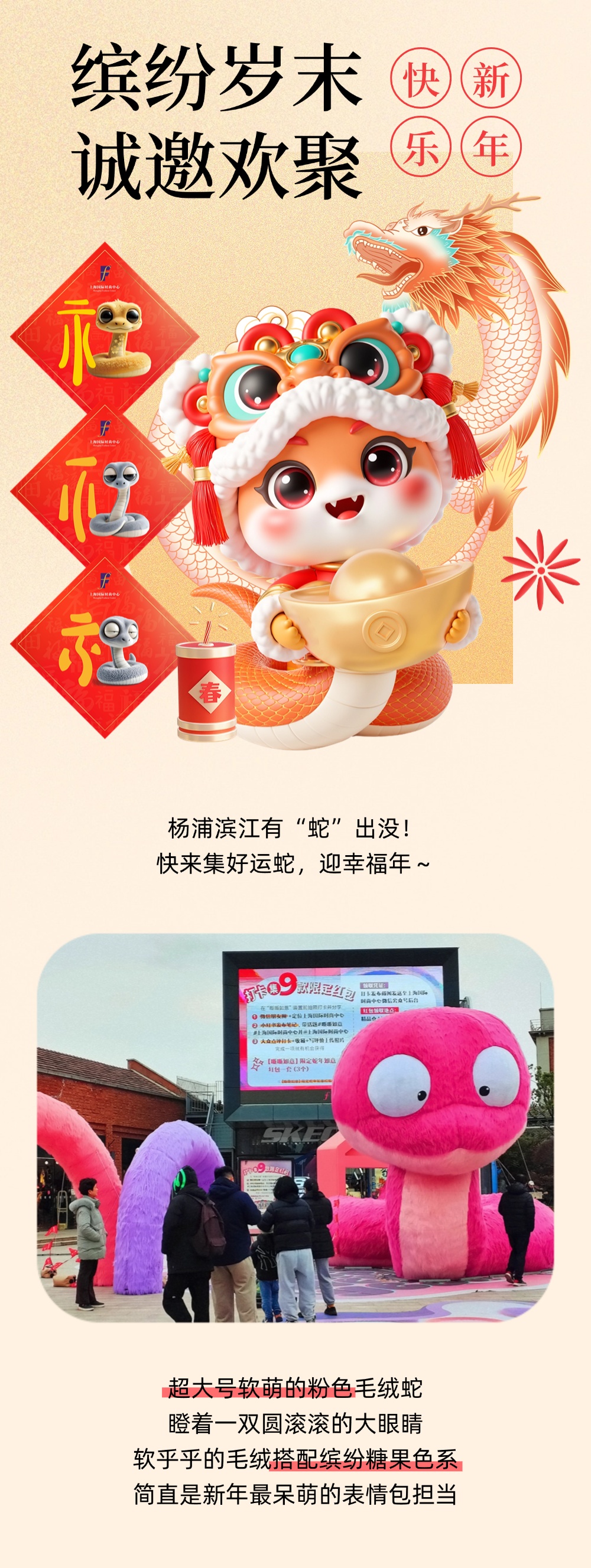 春节期间,杨浦推出了“乐享city·蛇年新春嗨购计划”,通过商旅文体展各领域的资源互补、内容交融与流量共享,精心策划了超过30场迎接新春的促销活动。各大商场备足了惊喜与优惠,诚邀广大市民及游客前来享受购物的乐趣!