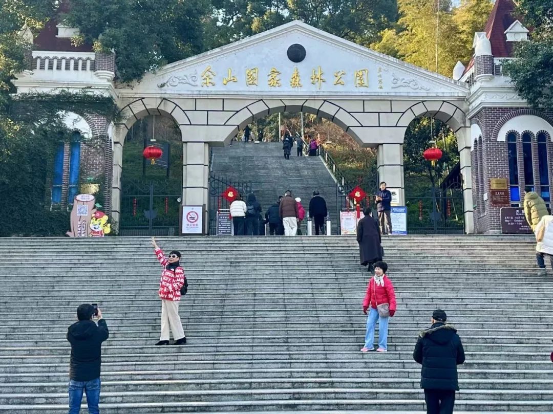 早晨8时,三五成群的市民陆续来到佘山脚下,或全家集体出动,或亲朋好友结伴,循着阳光拾级而上,路过沿途的观光平台时便驻足停留。登山步道两侧,成串的红灯笼悬挂在树梢,喜庆的装扮让年味更浓。