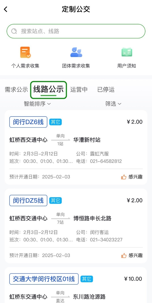 市民朋友们可以通过“随申行”APP或微信小程序的首页进入“定制公交”模块,点击“线路公示”查询春运定制公交保障线路的走向、站点、班次、价格等信息。开通后的相应线路将于“运营中”进行展示。